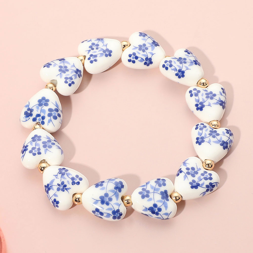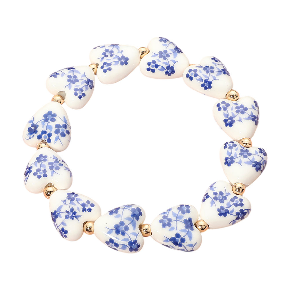 Details • Size : 0.6" H • Stretchable • Elegant stretch bracelet featuring porcelain-style heart beads adorned with delicate floral patterns and gold accents. A timeless accessory that adds charm and sophistication to everyday looks. • Lead and Nickel Compliant