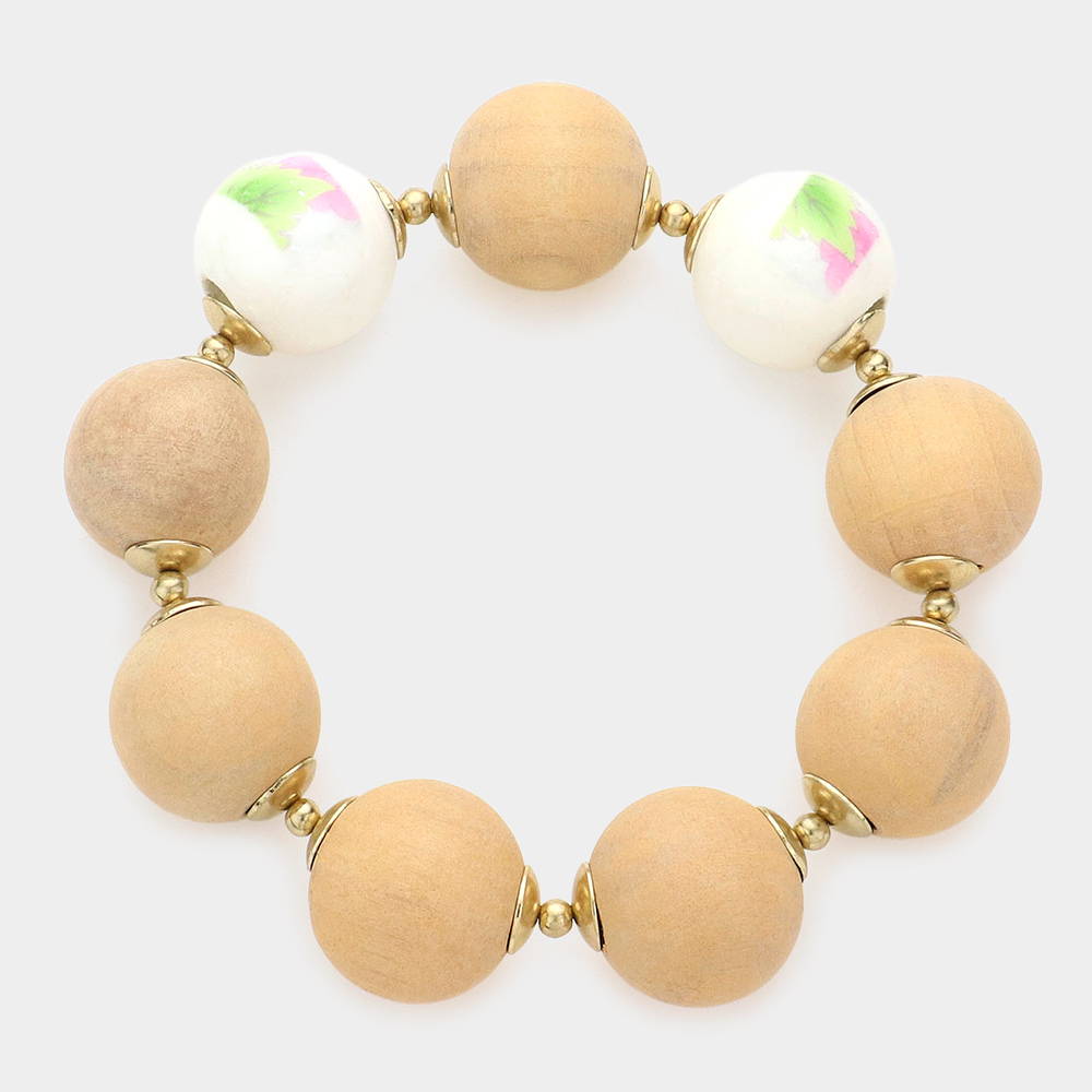 Flower Print Ceramic Ball Wood Stretch Bracelets