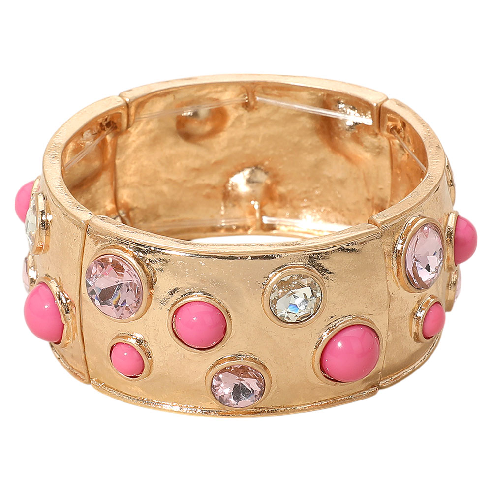 • Turn heads with this bold gold-tone cuff bracelet, featuring a wide band design studded with glossy beads and clear crystal-like stones. Stretch fit for easy wear. Perfect for party looks, evening outfits, or adding glam to your everyday style.