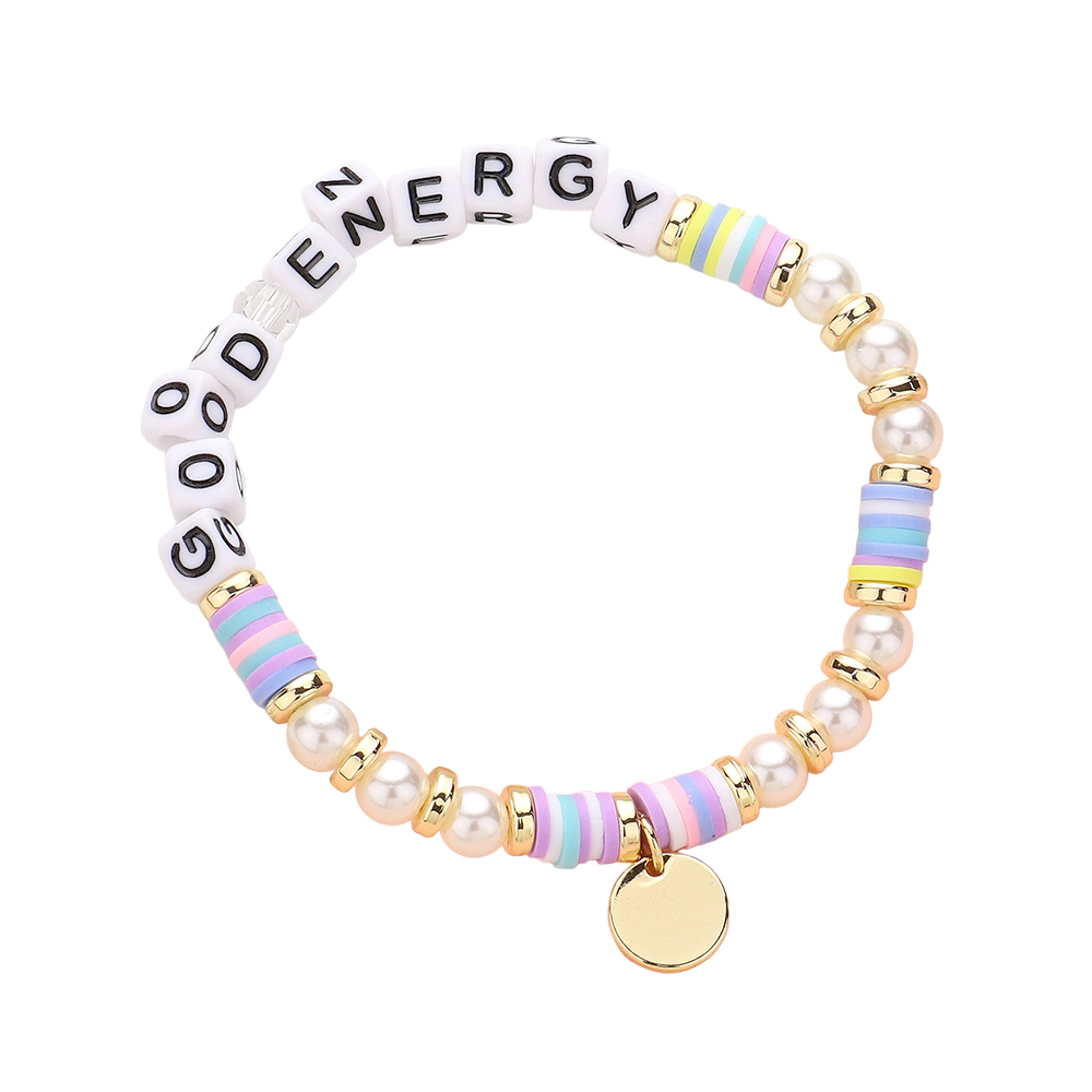 GOOD ENERGY Message Pearl Heishi Beaded Metal Disc Plate Charm Stretch Bracelet