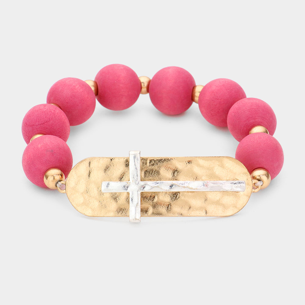 Hammered Metal Cross Wood Bracelet