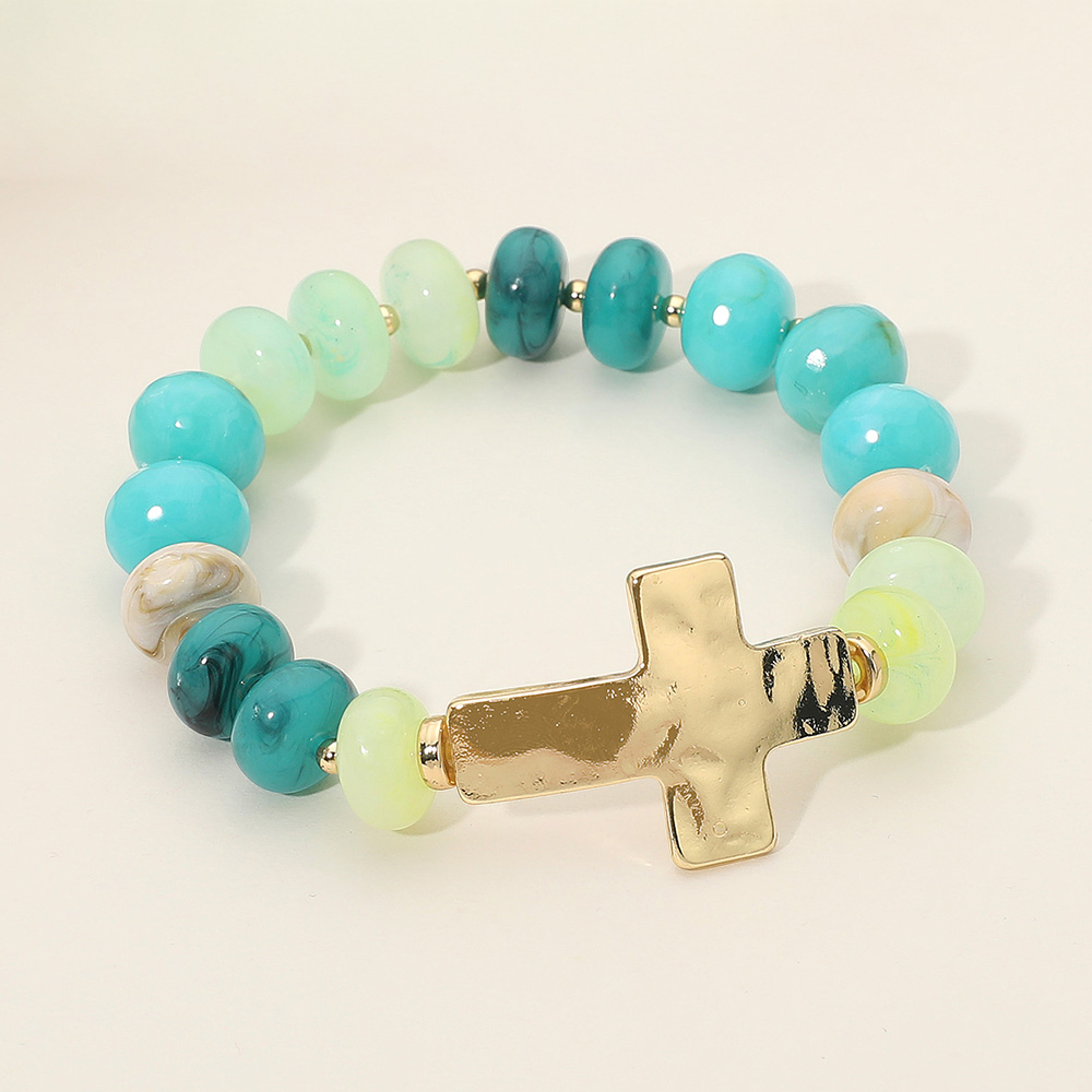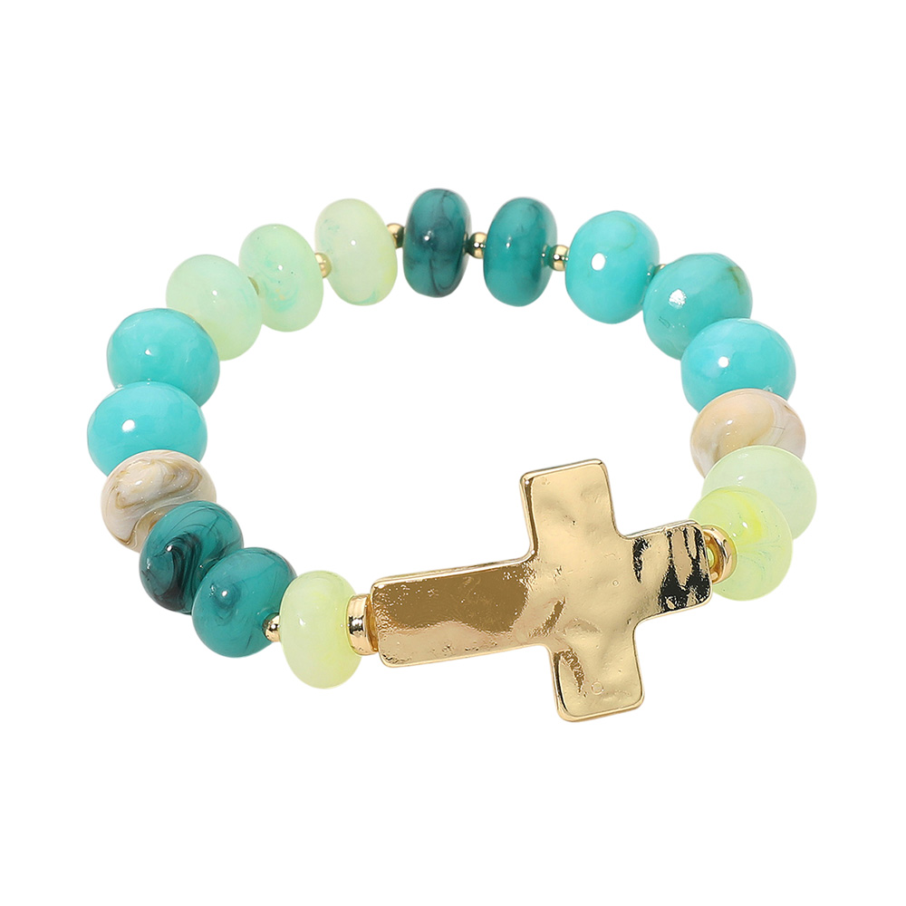 • Colorful beaded stretch bracelet featuring glossy round beads and a bold cross charm centerpiece. Comfortable and stylish, this bracelet makes a meaningful accessory for everyday wear or as a thoughtful gift.