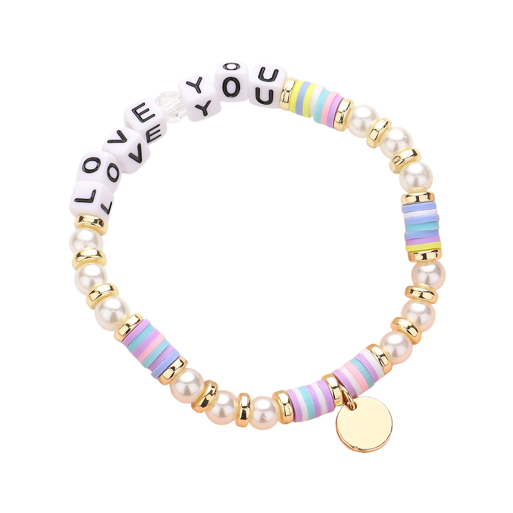 LOVE YOU Message Pearl Heishi Beaded Metal Disc Plate Charm Stretch Bracelet