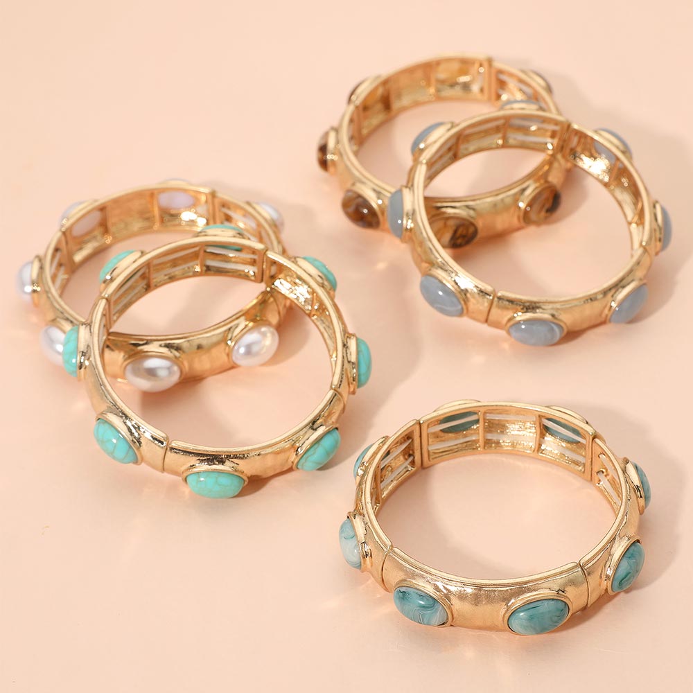 Marbled Oval Stone Accent Hammered Metal Beaded Stretch Bracelet