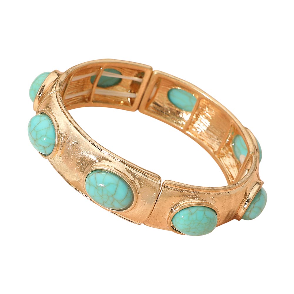 Details • Size : 0.6" H • Stretchable • This textured stretch bracelet is adorned with oval cabochon-style accents, giving it a bold and artistic appeal. Designed for comfort and easy wear, it’s a versatile piece that adds a touch of statement style to both casual and dressy outfits. • Lead and Nickel Compliant