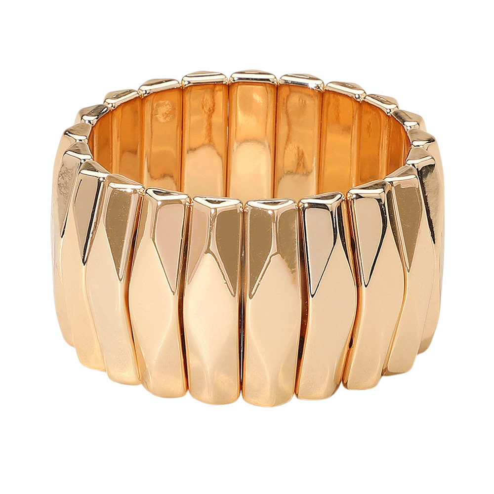 Details • Size : 1.5" H • Stretchable • Elevate your accessory game with this wide stretch link bracelet featuring bold, faceted segments and a comfortable fit. Its sculptural design adds a modern edge to any outfit, making it a standout piece for both everyday wear and special occasions. • Lead and Nickel Compliant