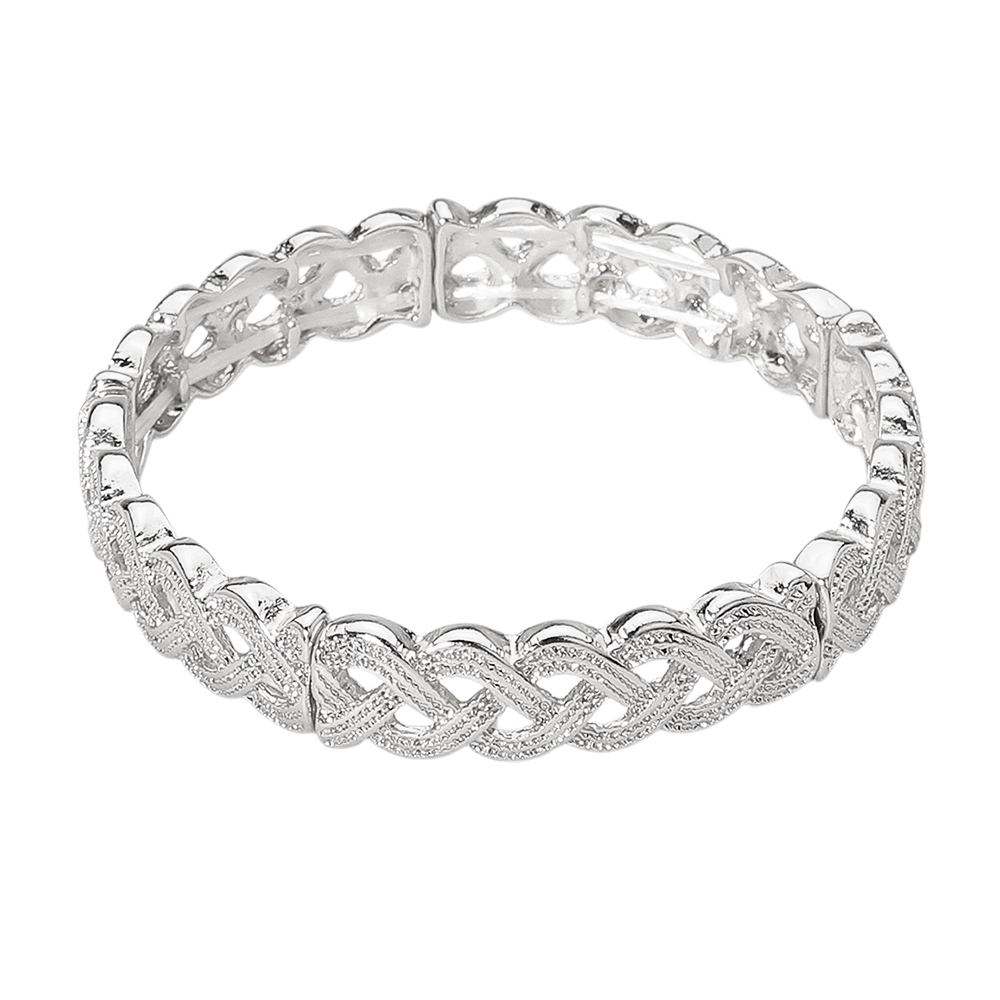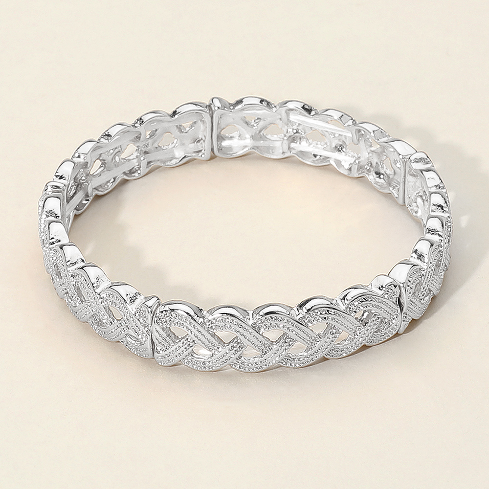 Details • Size : 0.5" H • Stretchable • Statement bracelet with a bold textured link pattern and secure clasp. Adds elegance and shine to any outfit, perfect for both casual and formal occasions. A timeless accessory for your collection. • Lead and Nickel Compliant