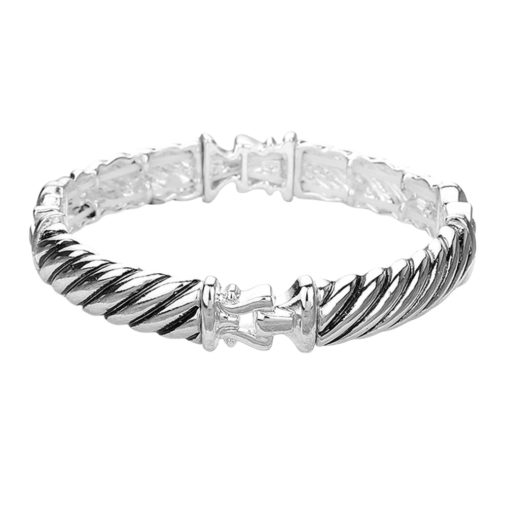 Details • Size : 0.5" H • Stretchable • Elegant stretch bracelet featuring a silver-tone twisted cable design with subtle center accents. Comfortable and easy to wear, it brings timeless style to both casual looks and special occasions. • Lead and Nickel Compliant
