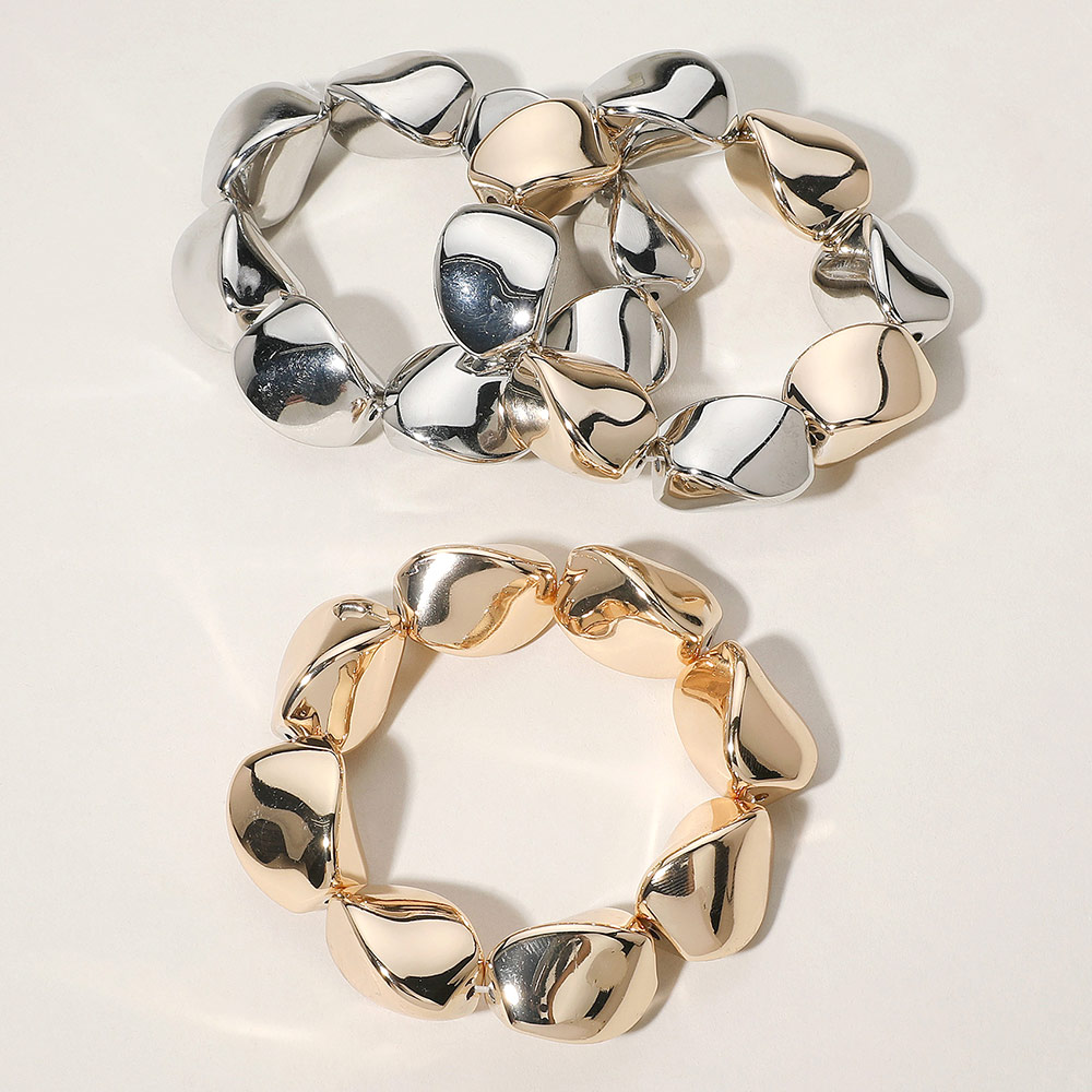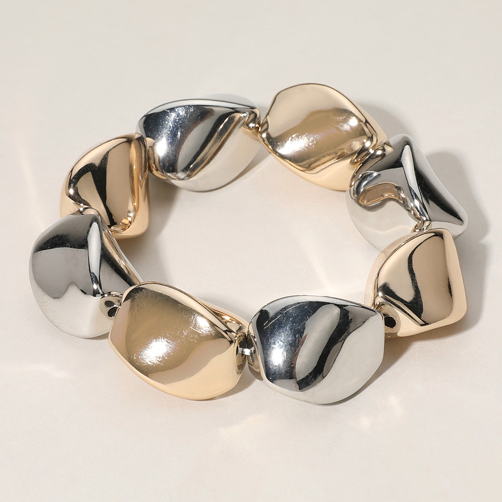 Details • Size : 0.7" H • Stretchable • This sculpted stretch bracelet features fluid, organic links in a striking two-tone finish. Designed for comfort and style, it offers a bold, contemporary look that pairs effortlessly with casual or dressy outfits. A versatile accessory with modern flair and artistic charm. • Lead and Nickel Compliant