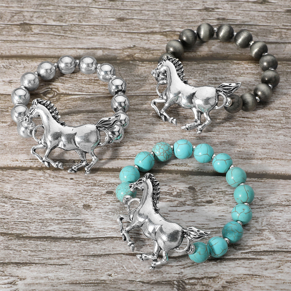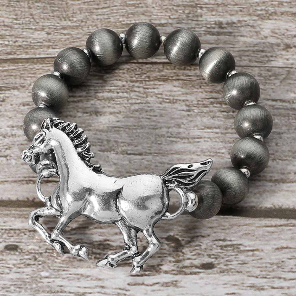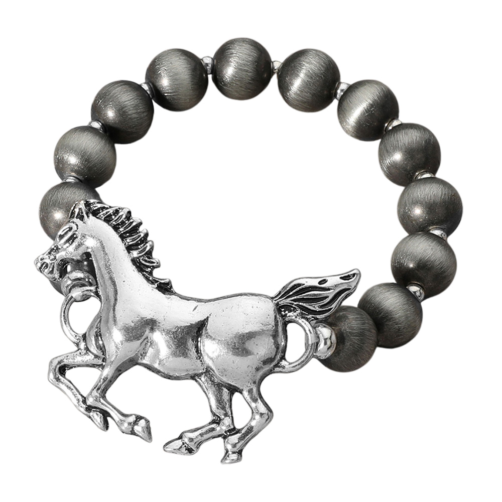Details • Size : 1.5" H • Stretchable • Stylish stretch bracelet featuring bold beads and a detailed horse charm centerpiece. Comfortable fit, versatile accessory, and a perfect gift for horse lovers or fans of western-inspired jewelry. • Lead and Nickel Compliant