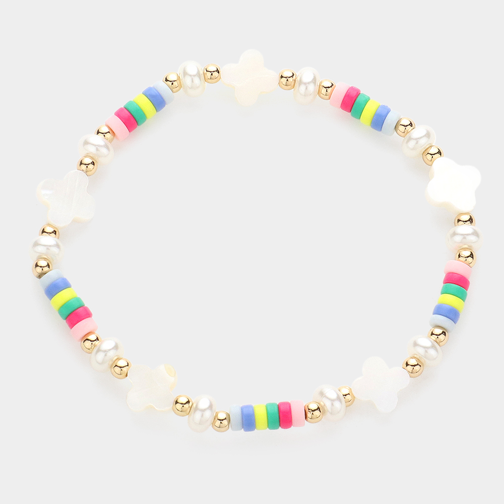 Mother Of Pearl Quatrefoil Pointed Heishi Beaded Stretch Bracelet
