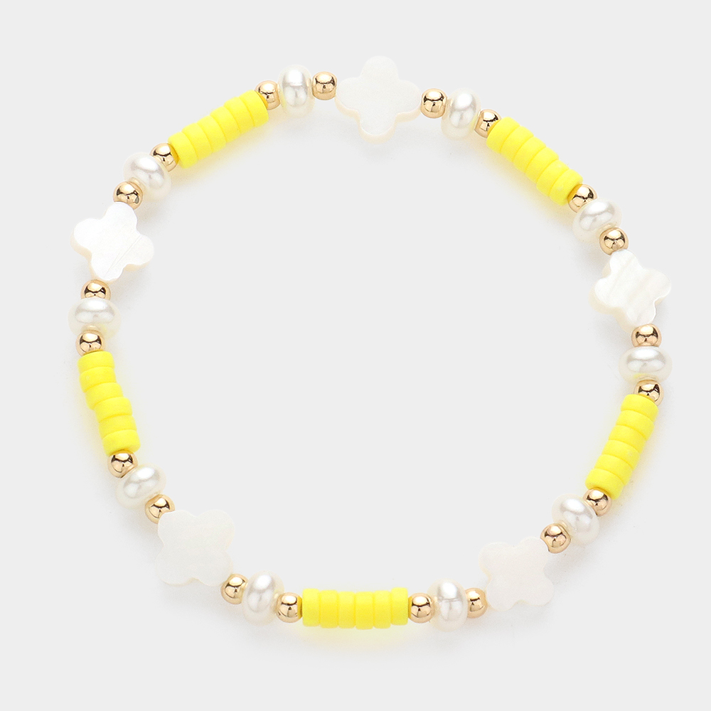 Mother Of Pearl Quatrefoil Pointed Heishi Beaded Stretch Bracelet