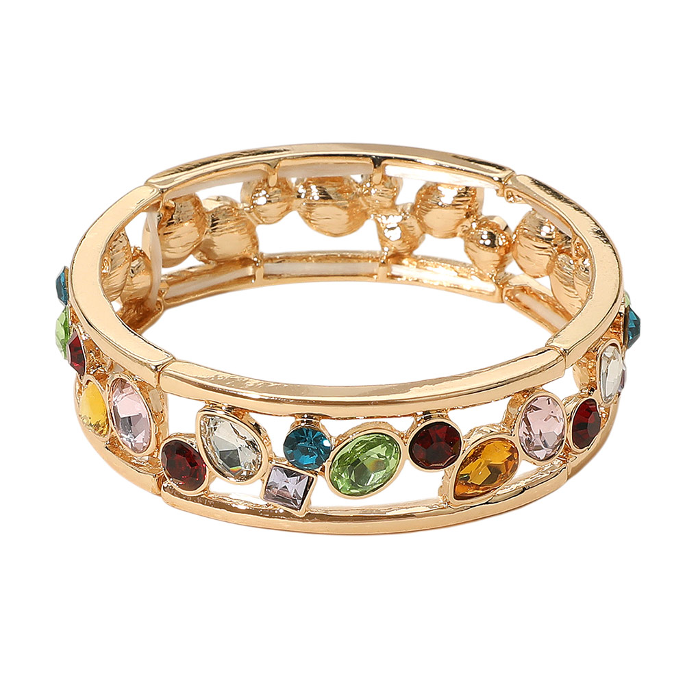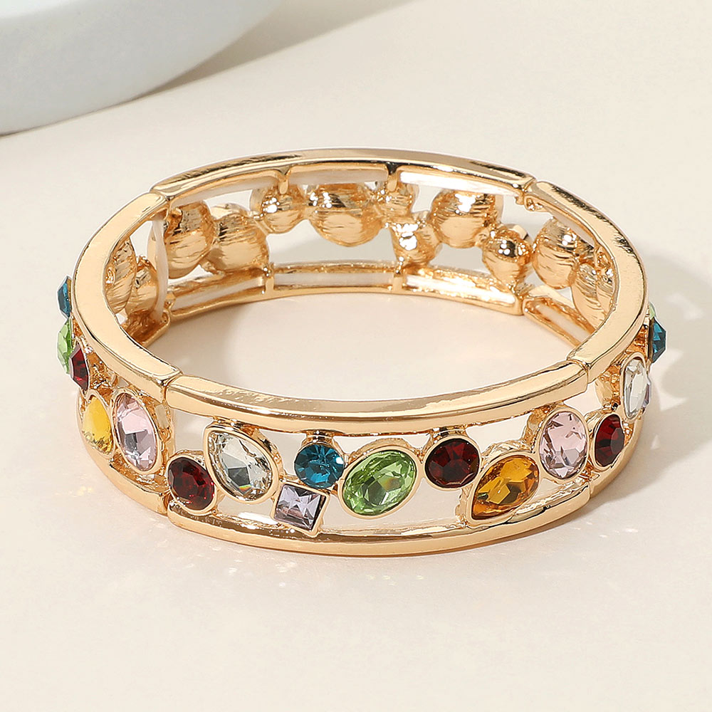 Details • Size : 0.6" H • Stretchable • Add vibrant elegance to your style with this open frame bracelet adorned with sparkling multicolor gem accents. The sleek, airy design paired with a variety of stone shapes and hues makes it a versatile piece, perfect for brightening any outfit from casual wear to special occasions. • Lead and Nickel Compliant
