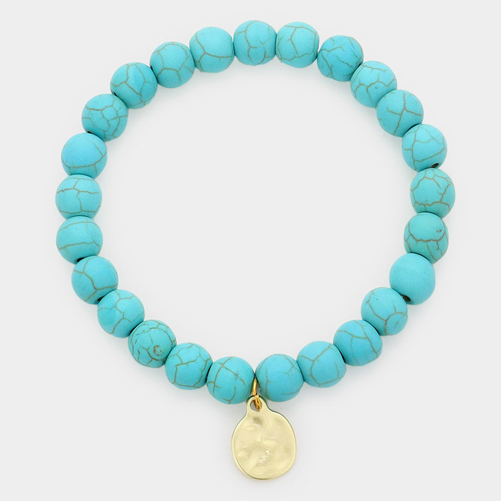 Natural Stone Hammered Metal Charm Stretch Bracelet