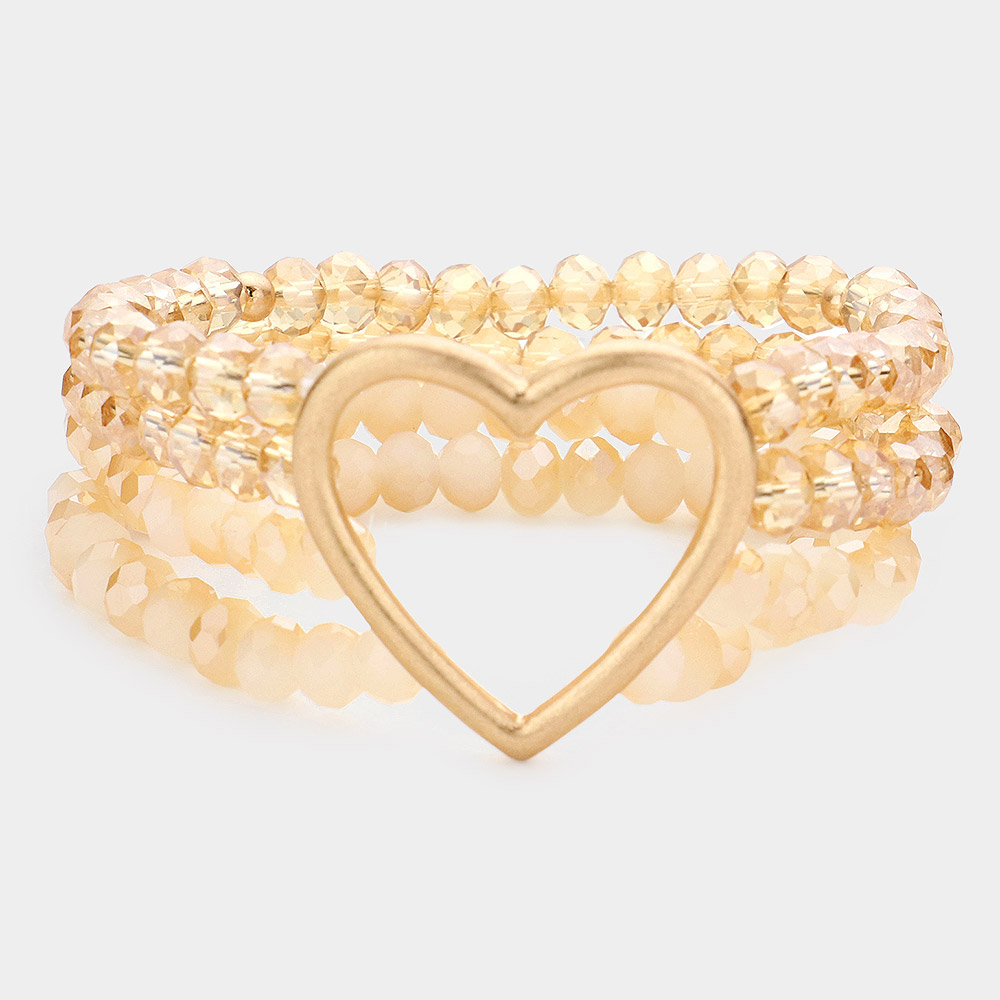 Open Metal Heart Accented Multi Layered Faceted Beaded Stretch Bracelet