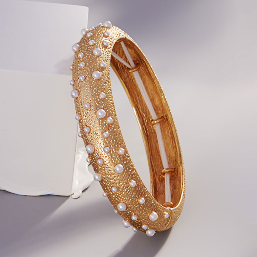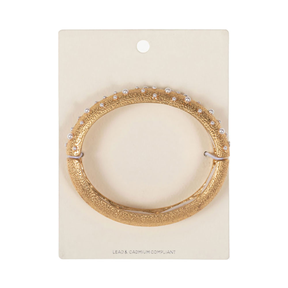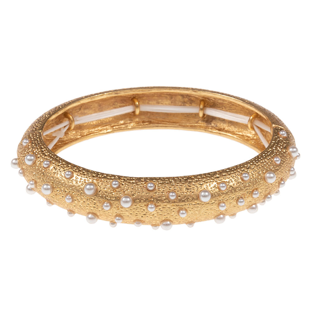 Details • Size : 0.6" H • Stretchable • Chic textured bangle featuring scattered pearl-like accents for a refined yet bold look. A stretch-fit bracelet that effortlessly elevates formal and everyday outfits with timeless elegance. • Lead and Nickel Compliant
