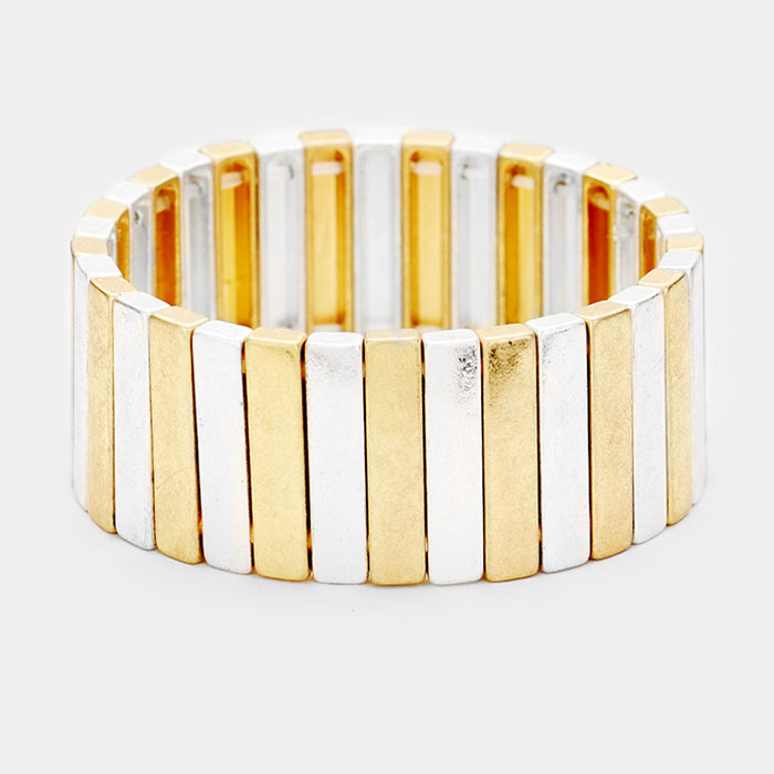• Wide stretch bracelet featuring smooth rectangular links arranged in a bold, uniform panel design. Flexible, easy to wear, and perfect for adding a modern, statement touch to everyday or evening outfits. A standout accessory with a clean, structured look.