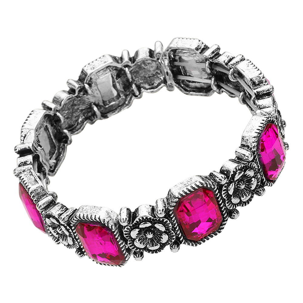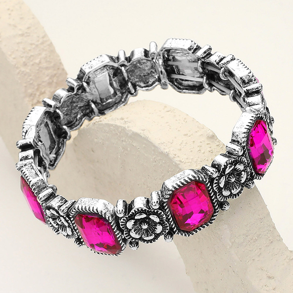 Rectangle Stone Cluster Western Metal Flower Link Stretch Bracelet