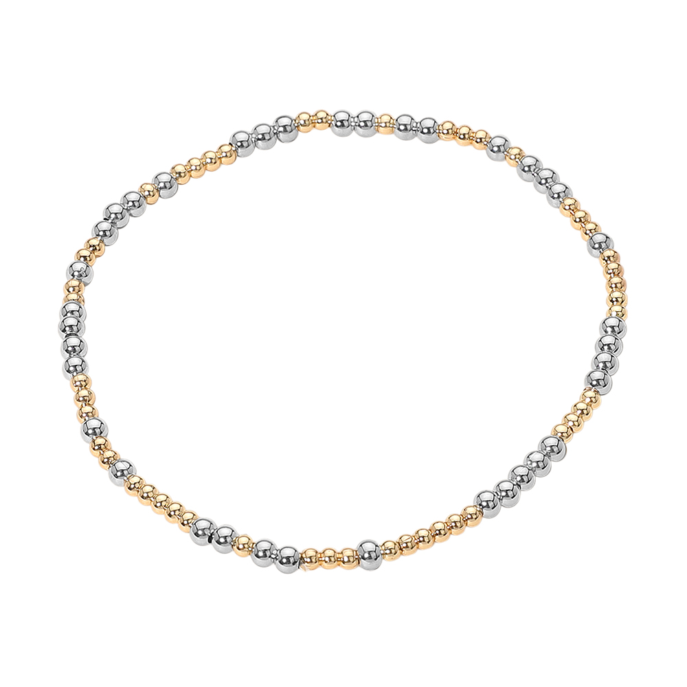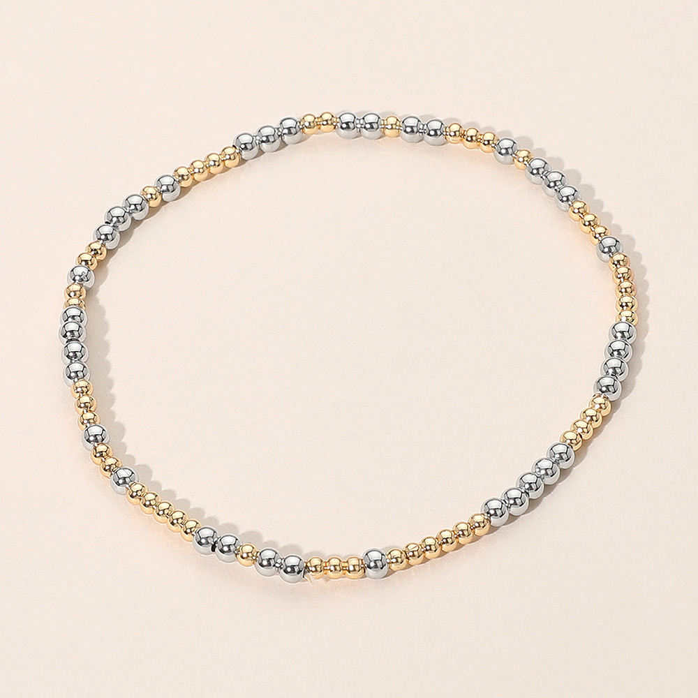 Details • Size : 1" H • Stretchable • Elegant stretch bracelet designed with alternating small metal beads in a two-tone finish. Perfect for layering or wearing solo, offering a refined and timeless look for everyday style. • Brass