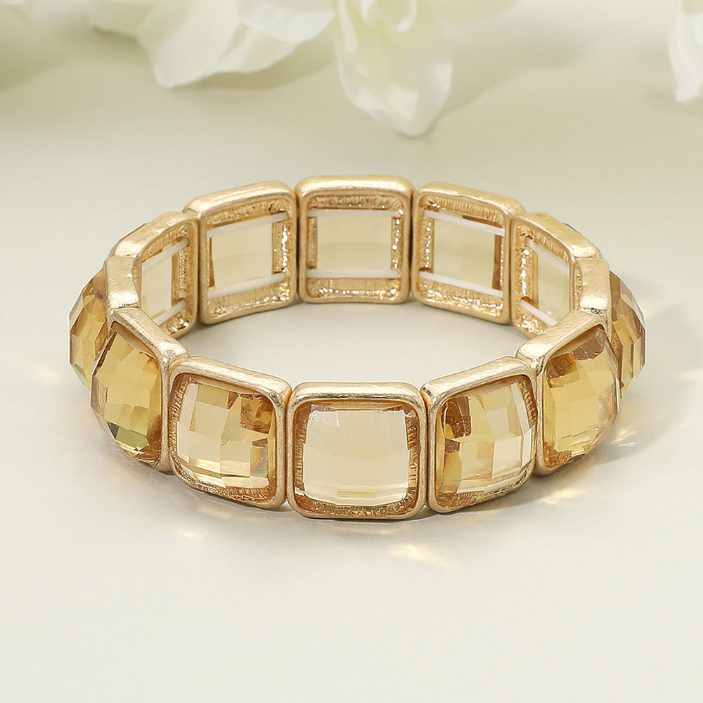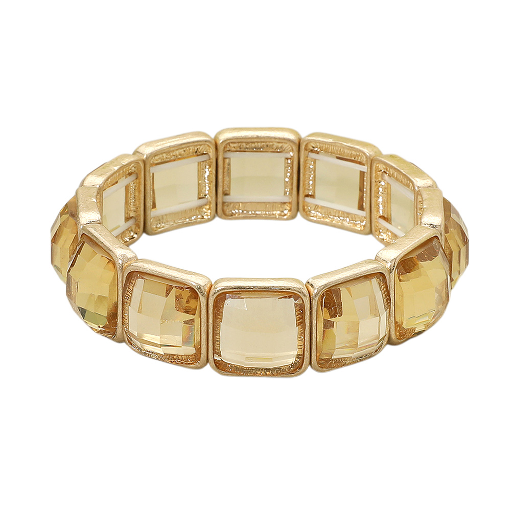 Details • Size : 0.6" H • Stretchable • Chic stretch bracelet featuring square-cut faceted gems in a polished gold-tone setting. Easy to wear with elastic band for a secure and comfortable fit. A statement accessory perfect for dressing up any look. • Lead and Nickel Compliant