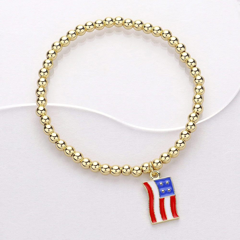 Stainless Steel Enamel American USA Flag Charm Pointed Stretch Bracelet