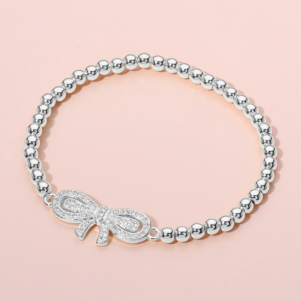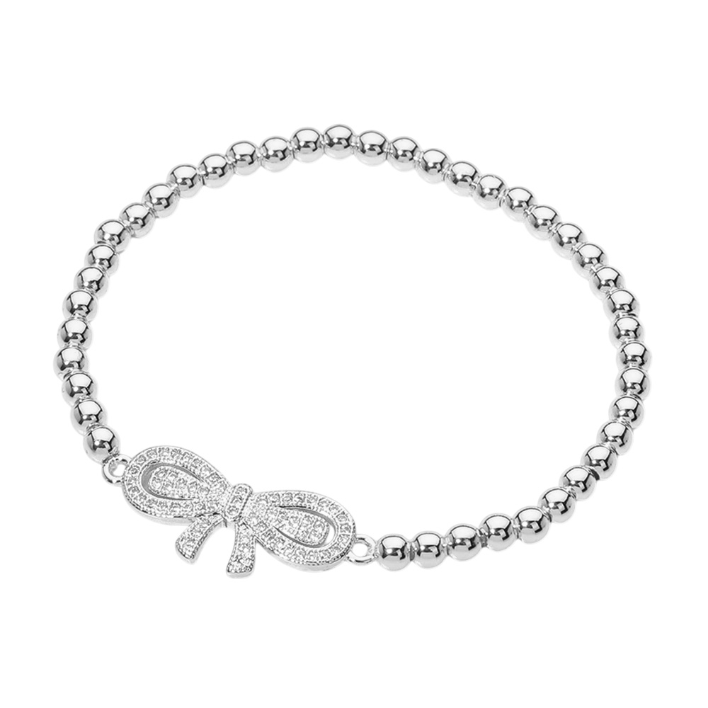 Stainless Steel Stone Paved Bow Ball Beaded Stretch Bracelet