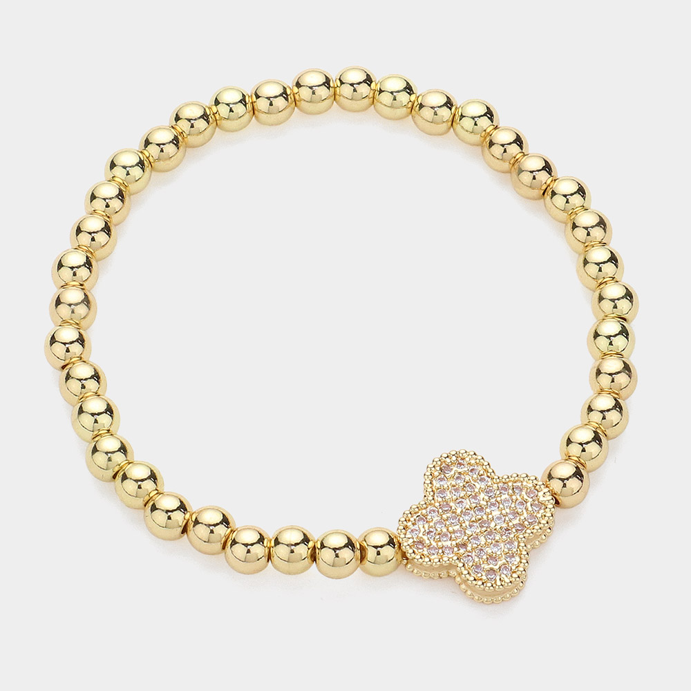 Stainless Steel Stone Paved Quatrefoil Charm Pointed Stretch Bracelet