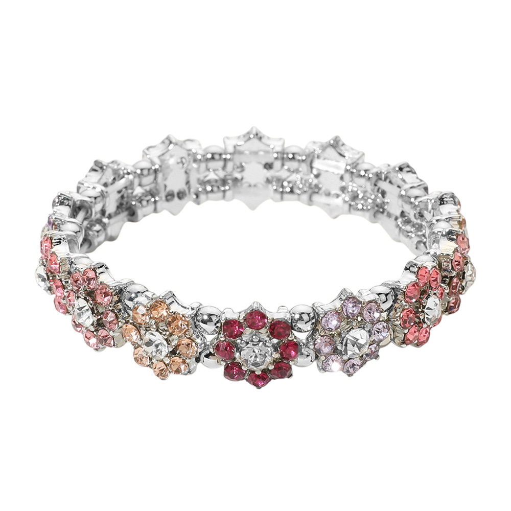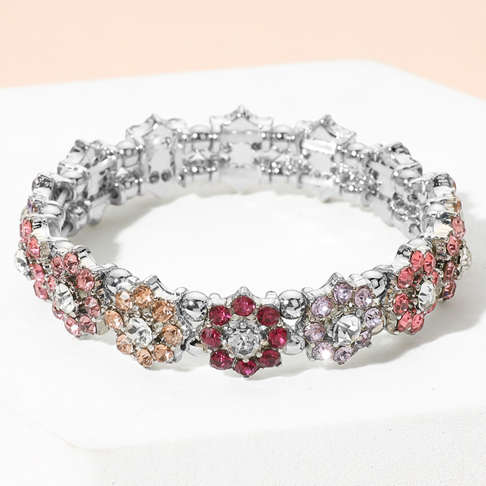 Details • Size : 0.5" H • Stretchable • Enhance your jewelry collection with this silver tone floral bracelet featuring dazzling multicolor gem clusters. Its intricate flower design adds a charming and feminine touch, making it perfect for special occasions or adding a vibrant accent to your everyday style. • Lead and Nickel Compliant