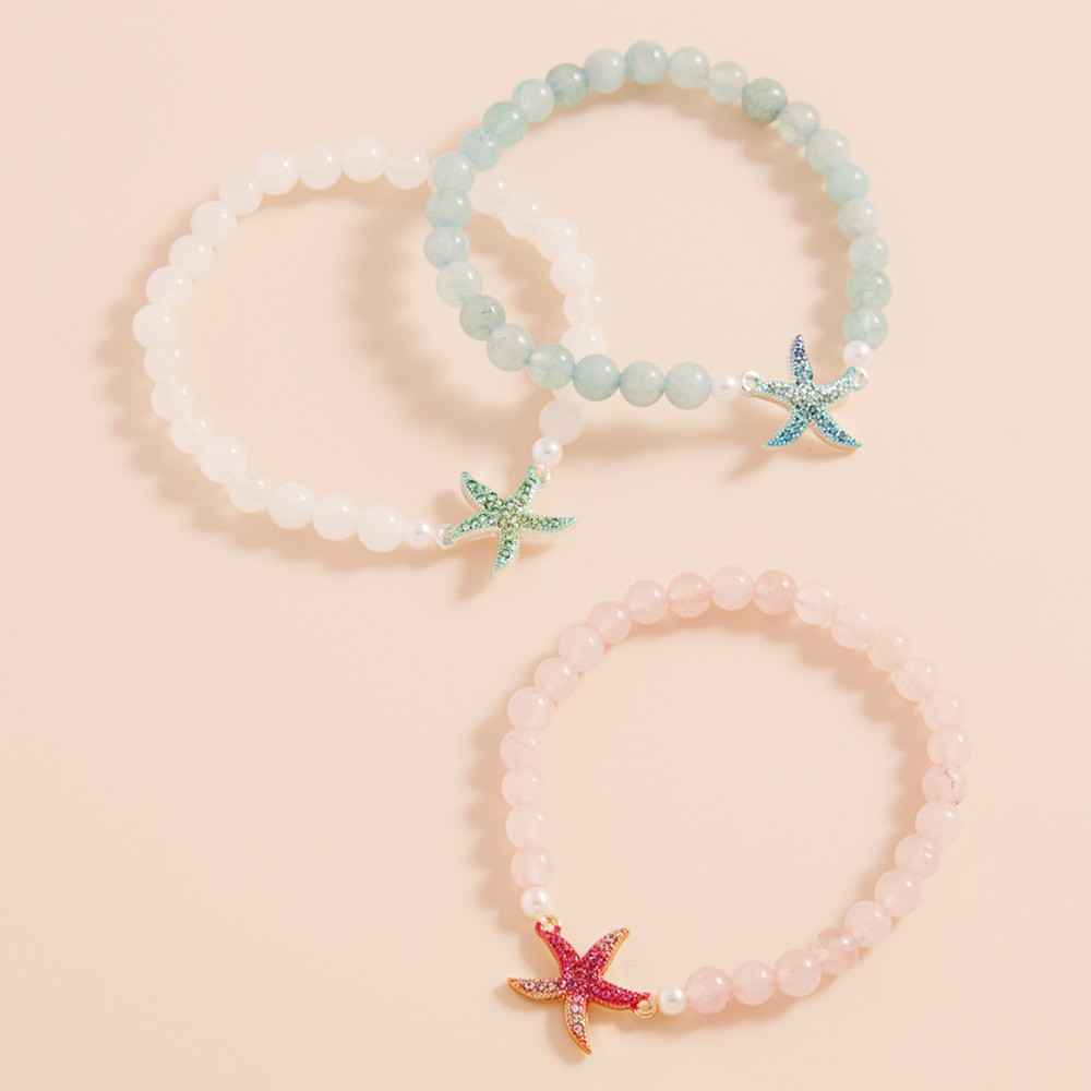 Stone Paved Colored Metal Starfish Faceted Beaded Stretch Bracelet