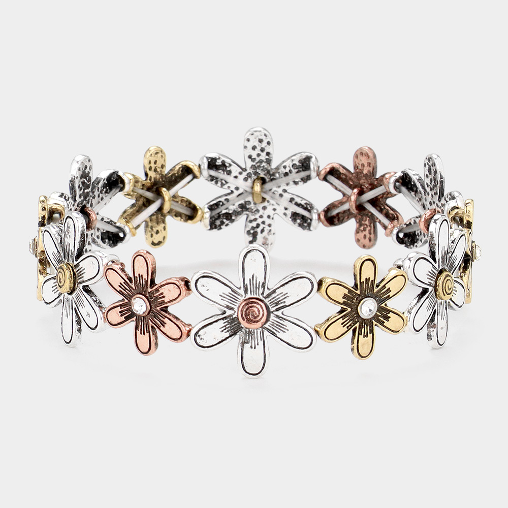 Stone Pointed Metal Flower Link Stretch Bracelet
