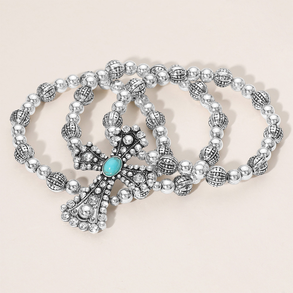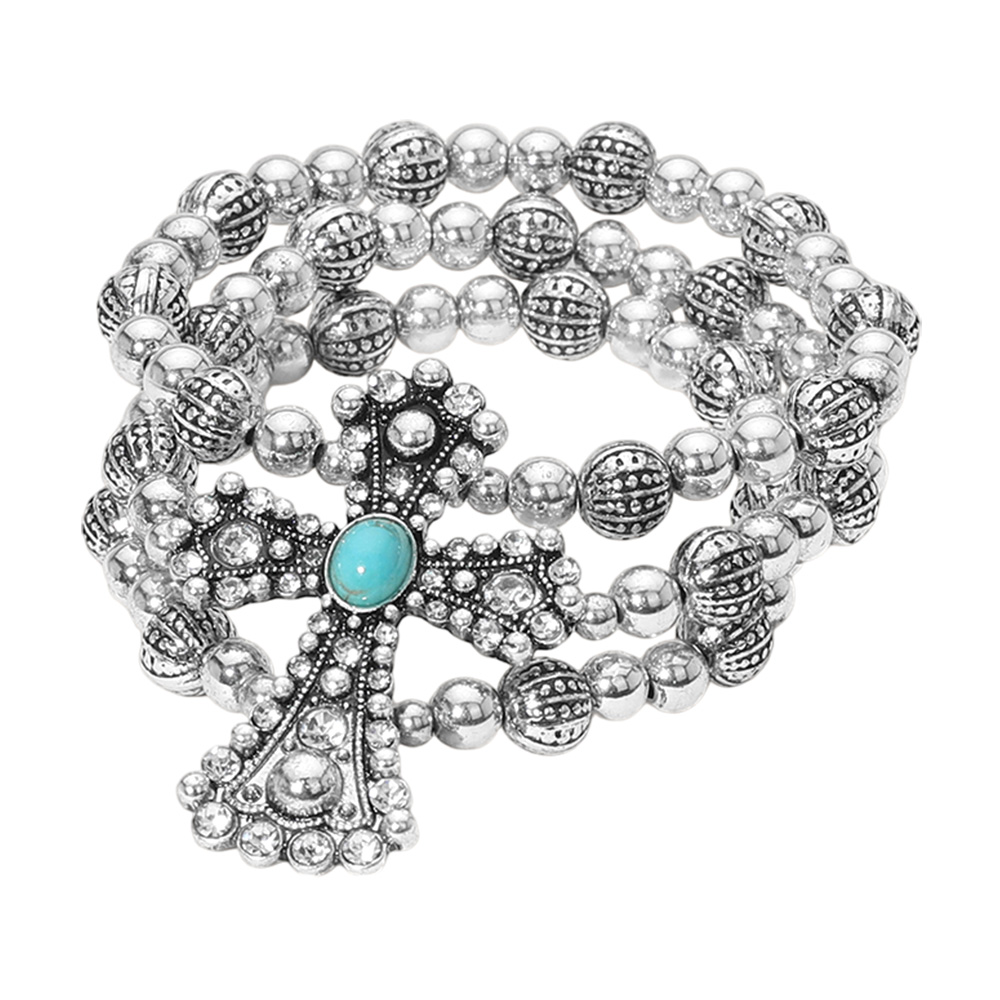 Details • Size : 1.6" H • Stretchable • Statement stretch bracelet featuring layered strands of polished beads and a bold cross charm centerpiece. A standout accessory perfect for adding a symbolic and textured touch to your jewelry collection. • Lead and Nickel Compliant