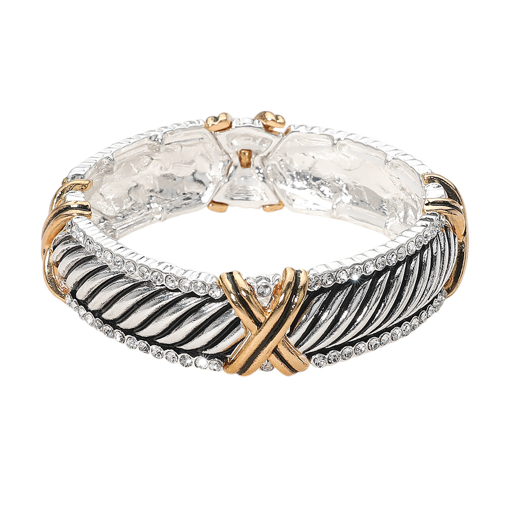 Details • Size : 0.75" H • Stretchable • Make a statement with this textured cuff bracelet, highlighted by sparkling crystal accents and a bold X motif centerpiece. Its intricate rope-inspired design and polished finish offer a timeless, versatile accessory perfect for enhancing both casual outfits and evening attire. • Lead and Nickel Compliant