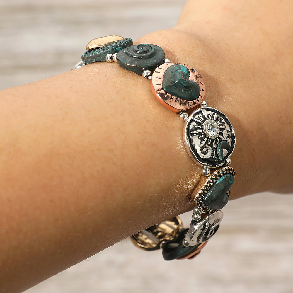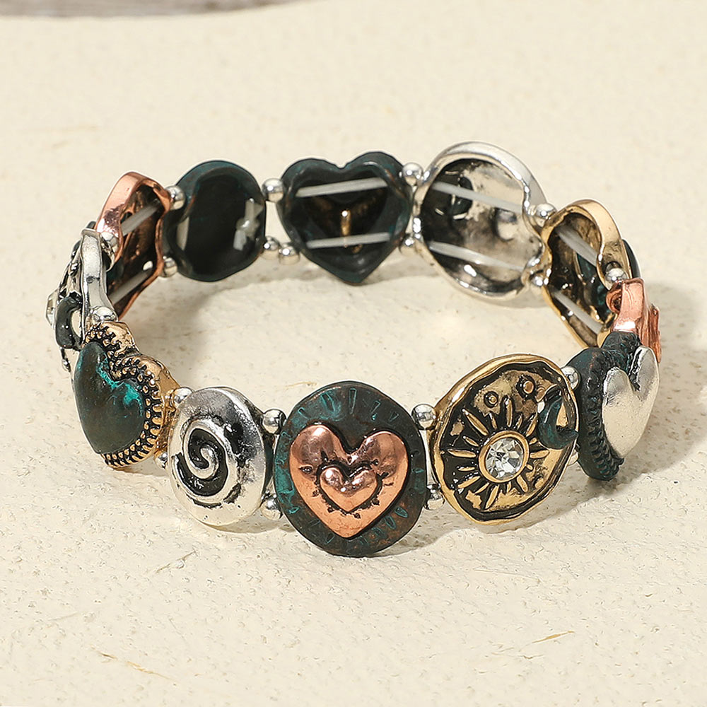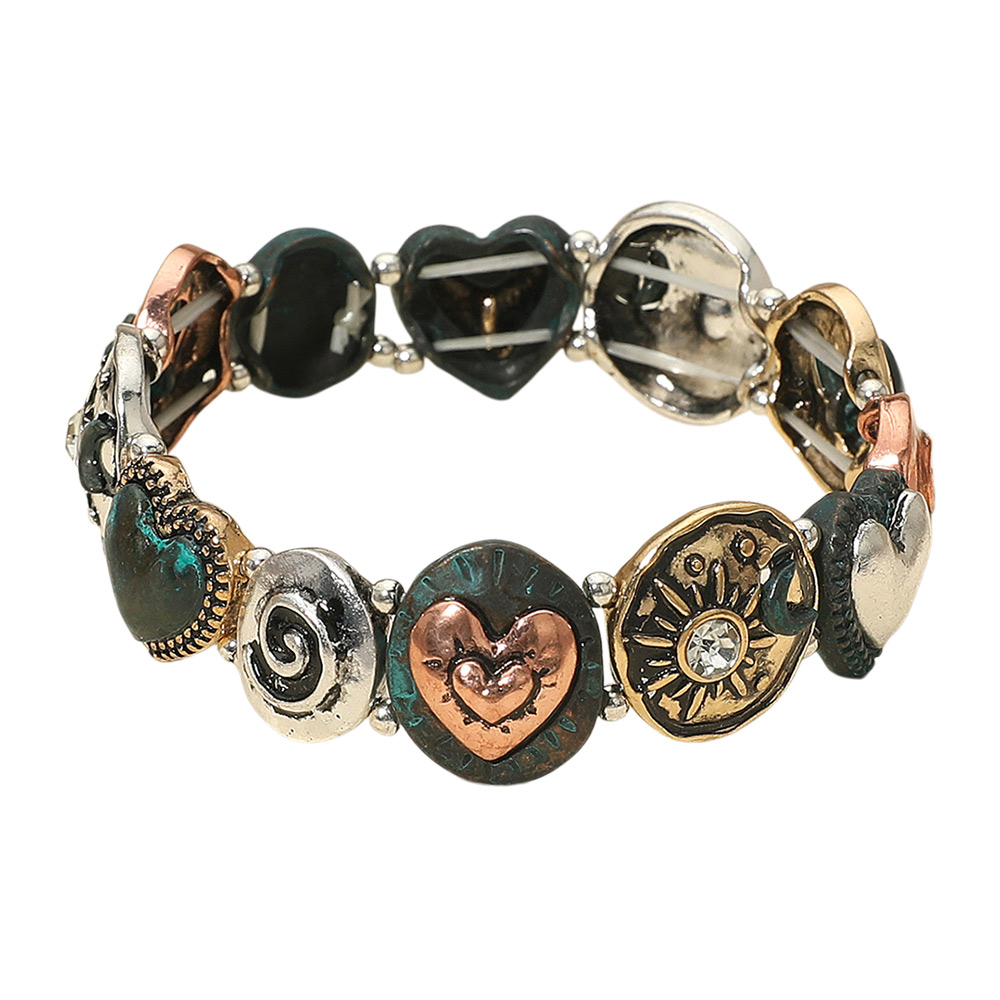 Details • Size : 0.7" H • Stretchable • This stretch bracelet features a mix of heart, swirl, and sunburst charms in beautifully blended metallic tones. Designed with intricate detailing, it offers a versatile and stylish accessory that adds artistic flair to casual or dressy outfits, making it a meaningful and chic jewelry piece. • Lead and Nickel Compliant