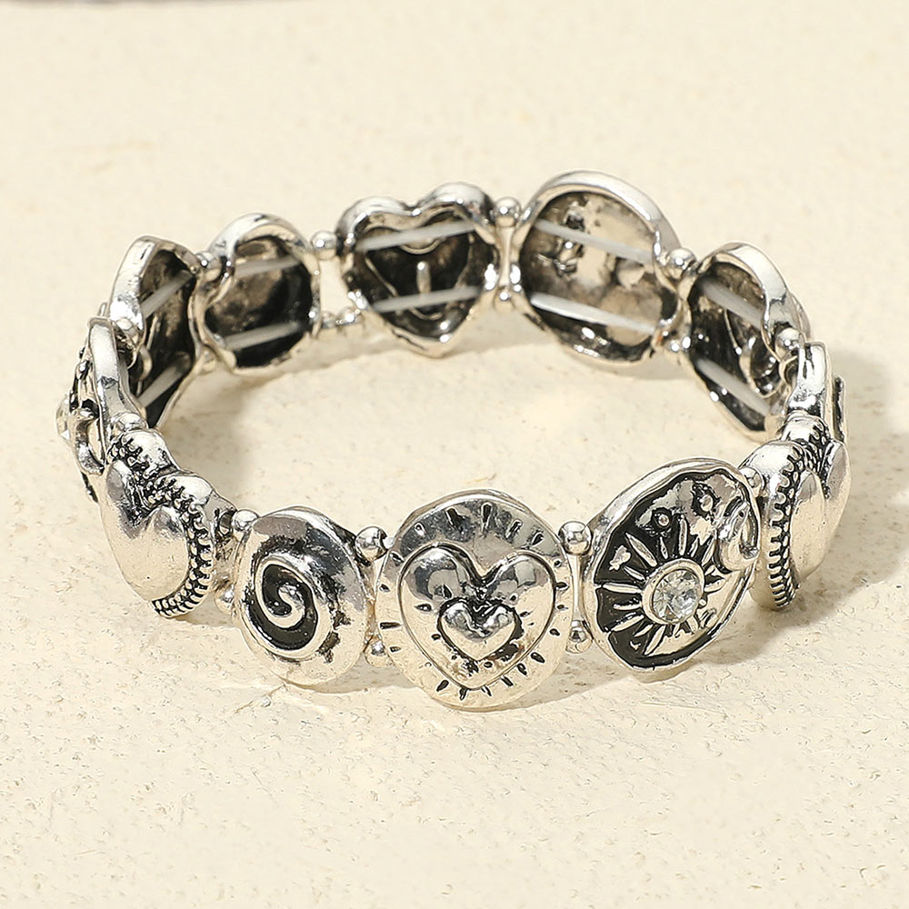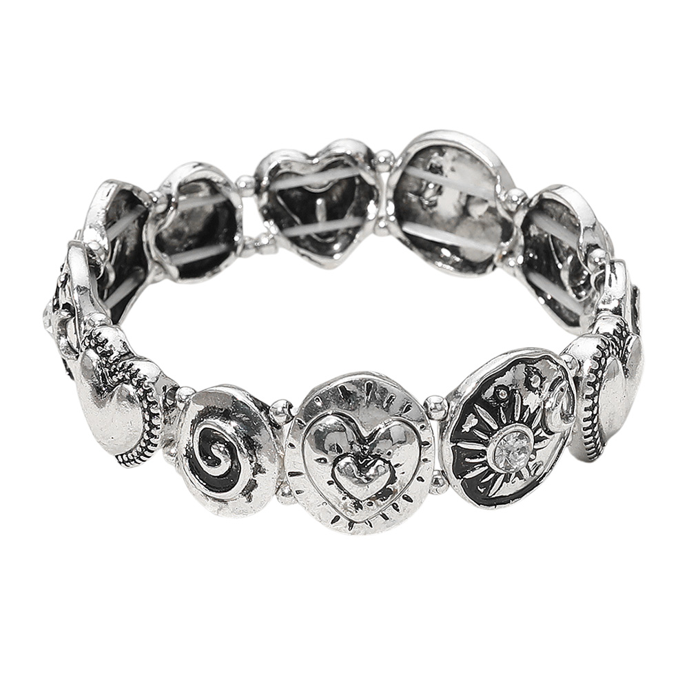 Vintage Stone Accent Antique Metal Mixed Heart Swirl Sunburst Crescent Charm Beaded Stretch Bracelet