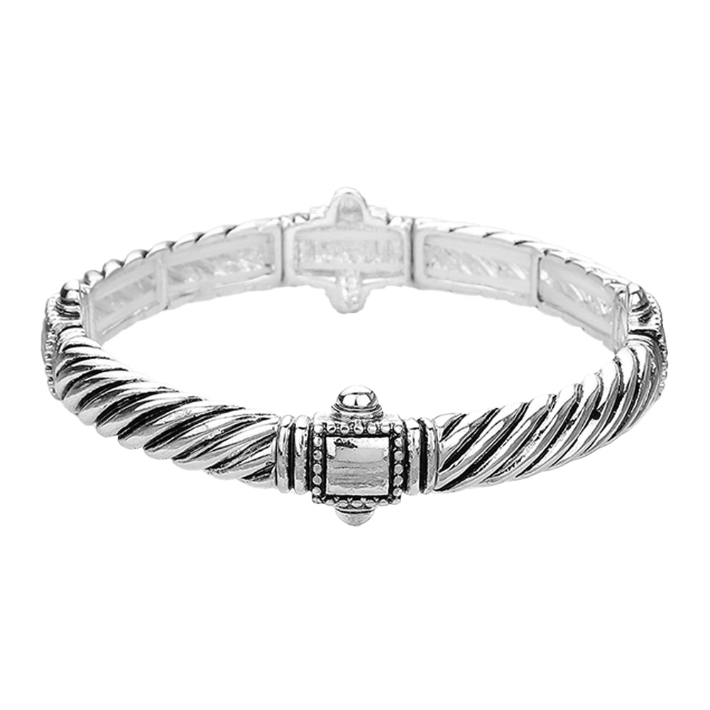 Details • Size : 0.6" H • Stretchable • Elegant hinged bracelet featuring a twisted cable design in two-tone finish with detailed center accents. Secure clasp and refined style make it perfect for adding a polished touch to any outfit. • Lead and Nickel Compliant