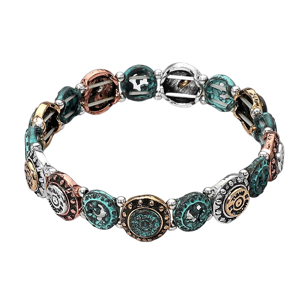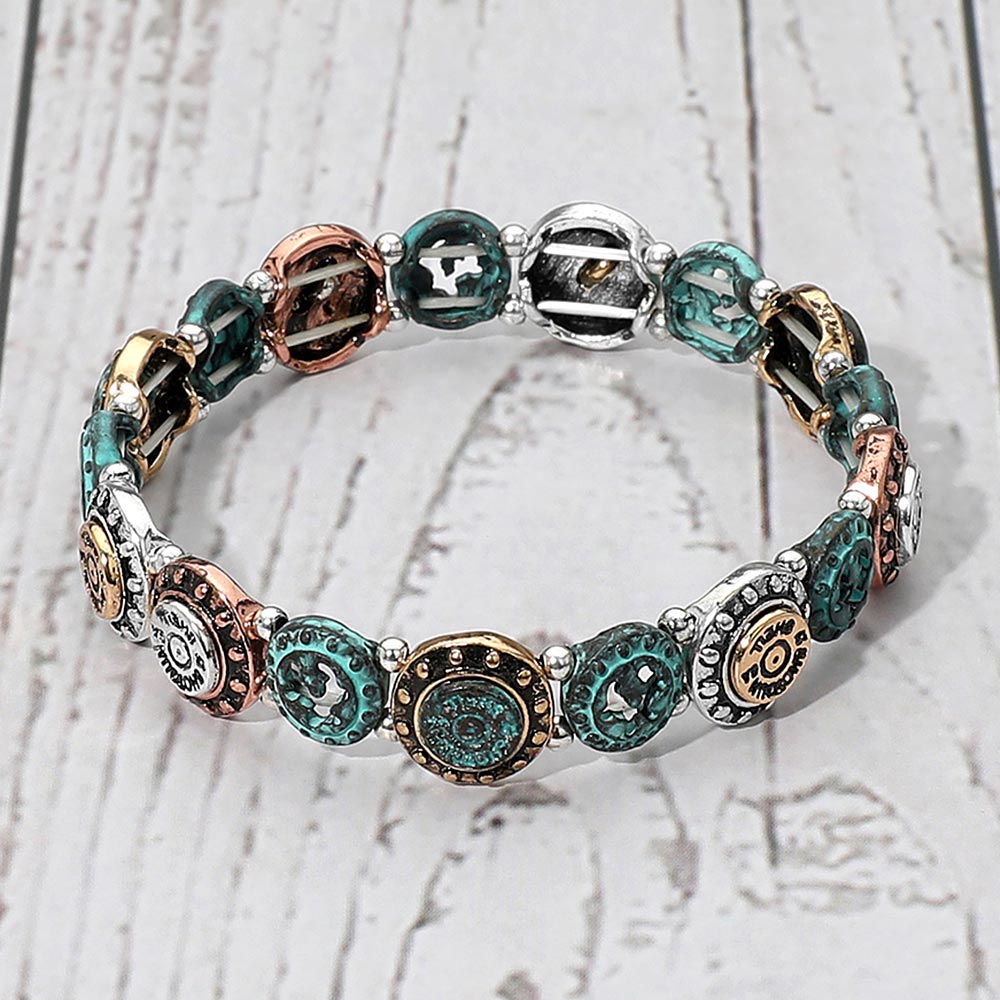 Details • Size : 0.5" H • Stretchable • Showcase your beliefs with this inspirational stretch bracelet adorned with round charms featuring faith-based icons and uplifting messages. The mixed metal tones and antique finish create a timeless look that blends seamlessly with everyday and spiritual wear. • Lead and Nickel Compliant