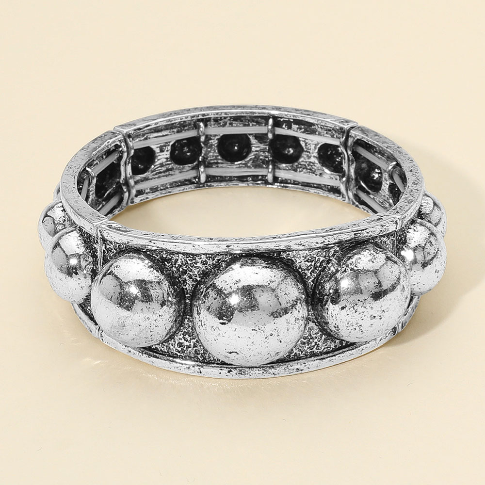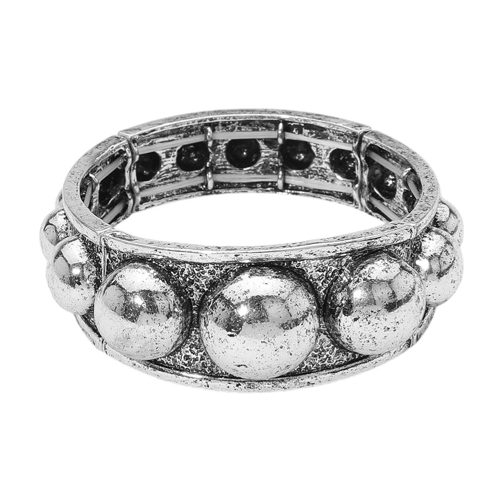 Details • Size : 1.2" H • Stretchable • Statement stretch bracelet featuring a wide band with bold raised dome detailing and a textured finish. Perfect for adding a dramatic, vintage-inspired edge to casual or dressy looks. • Lead and Nickel Compliant