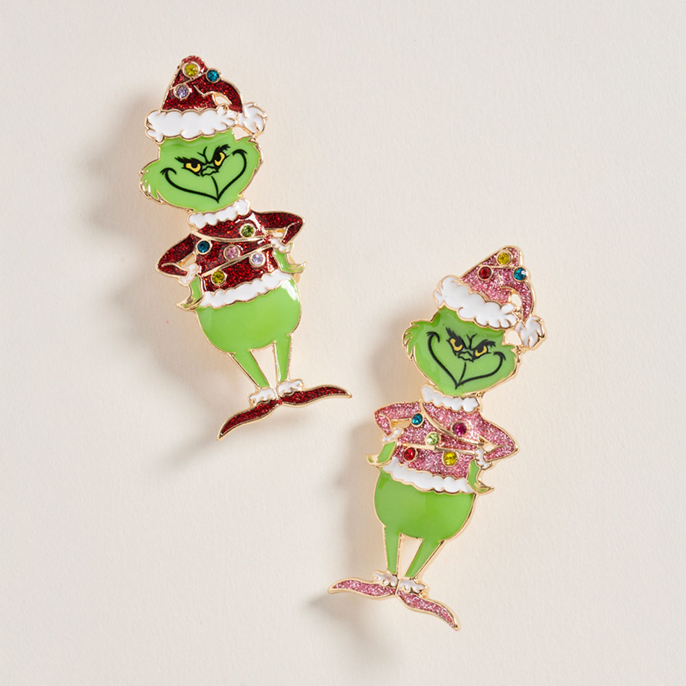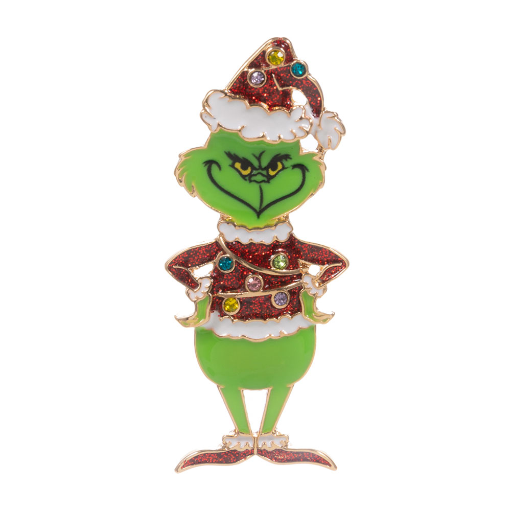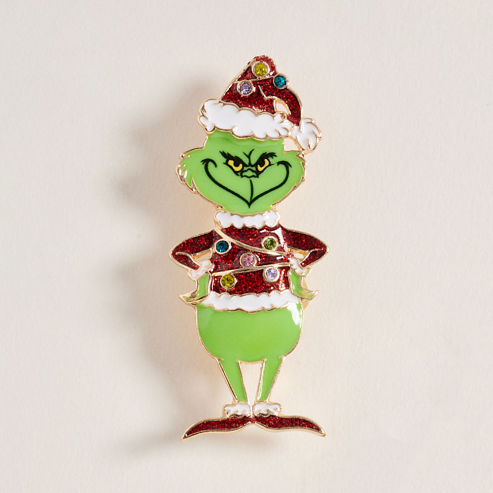 Details • Size : 1" X 2.3" • Pin Brooch • Bring playful charm to your holiday accessories with this glittery enamel pin featuring a grumpy green character dressed in festive cheer. A fun seasonal accent for jackets, bags, and stocking stuffers. • Lead and Nickel Compliant
