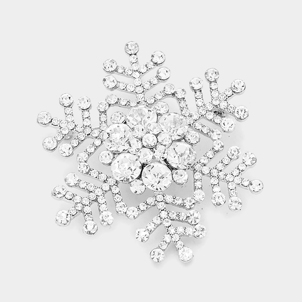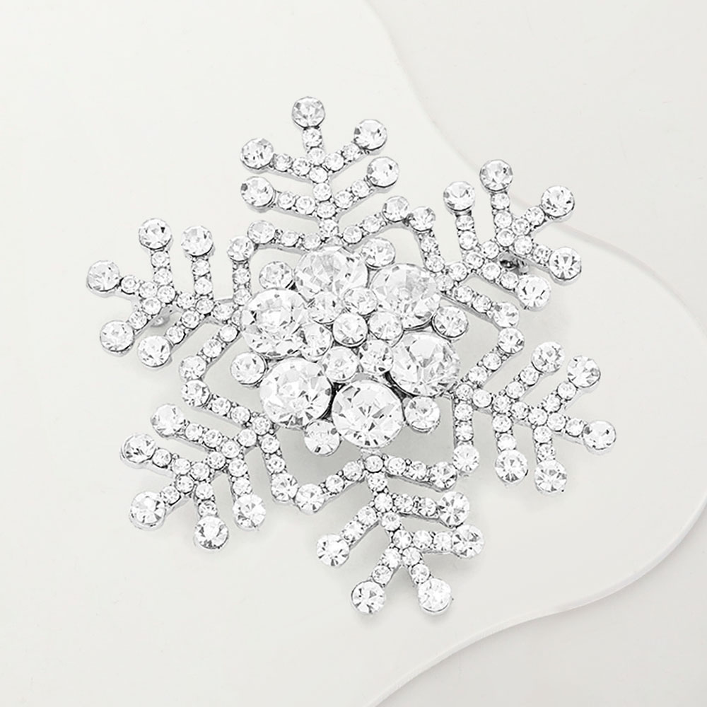 Details • Size : 2.5" L • Dual : Brooch / Pendant • Elegant snowflake brooch pin adorned with sparkling rhinestones, perfect for adding a festive touch to winter outfits, coats, scarves, or hats. Ideal accessory for holiday parties, weddings, or as a thoughtful seasonal gift. A stylish way to showcase charm and elegance during the winter season. • Lead and Nickel Compliant