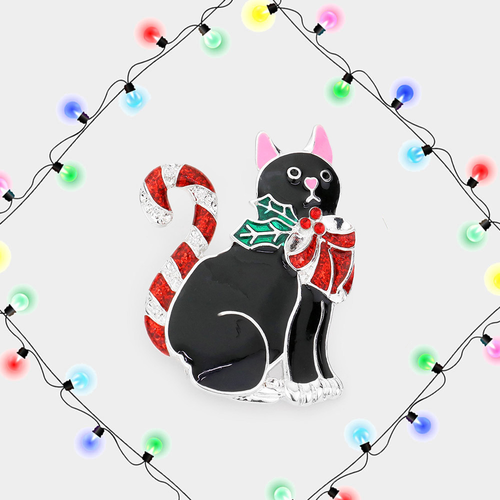 Details • Size : 1.5" X 1.8" • Pin Brooch • Add playful holiday charm with this festive cat brooch, featuring a candy cane tail, wrapped gift, and holly detail. A delightful accessory for cat lovers and holiday enthusiasts alike—perfect for parties or seasonal gifting. • Lead and Nickel Compliant