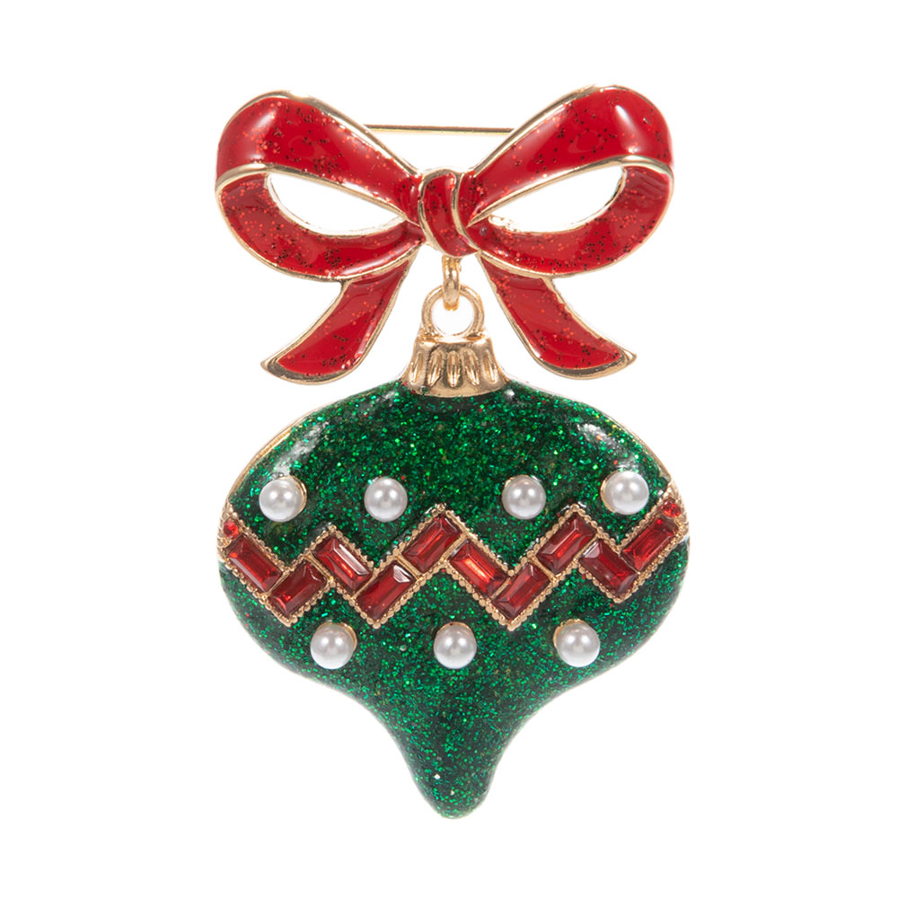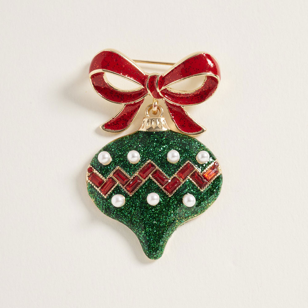• Add sparkle to your holiday look with this ornament-shaped brooch featuring a dazzling finish, pearl accents, and an elegant bow. Perfect for festive outfits, gift toppers, or seasonal flair.