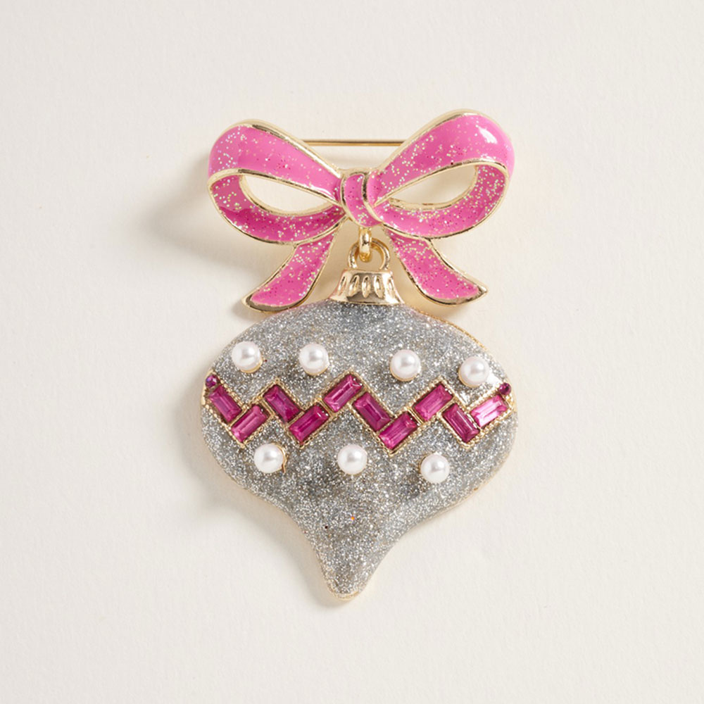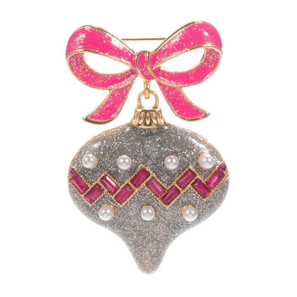 • Add sparkle to your holiday look with this ornament-shaped brooch featuring a dazzling finish, pearl accents, and an elegant bow. Perfect for festive outfits, gift toppers, or seasonal flair.