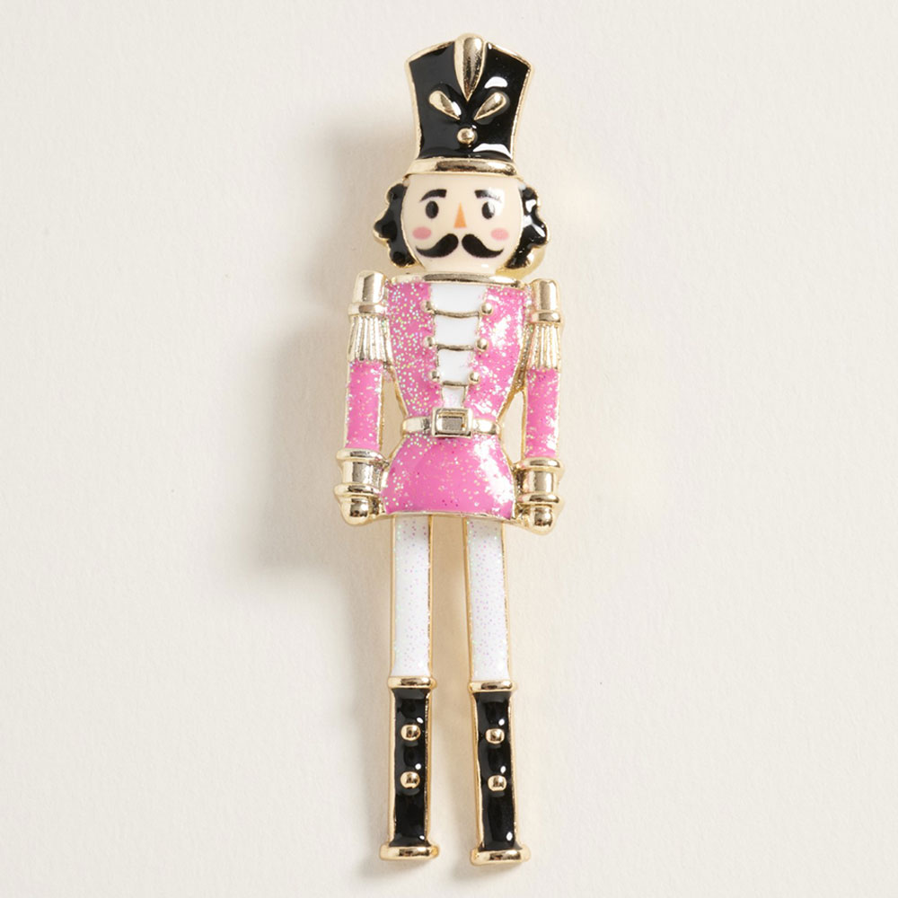 • Celebrate the season with a charming nutcracker soldier brooch featuring glittery detail and bold accents. A perfect holiday pin for coats, scarves, or festive party outfits.