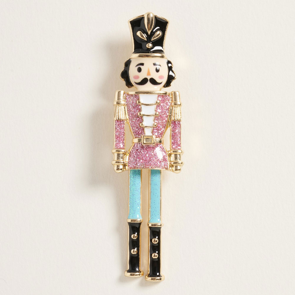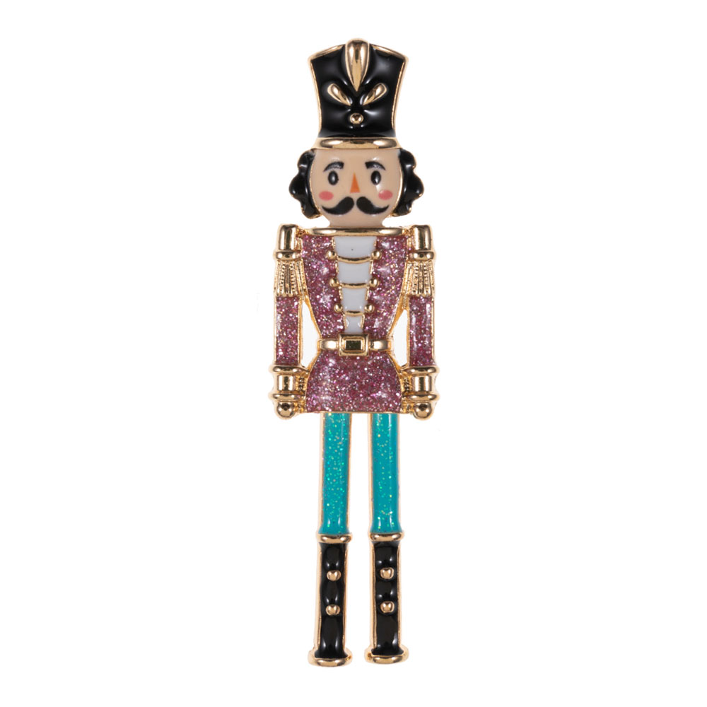 • Celebrate the season with a charming nutcracker soldier brooch featuring glittery detail and bold accents. A perfect holiday pin for coats, scarves, or festive party outfits.