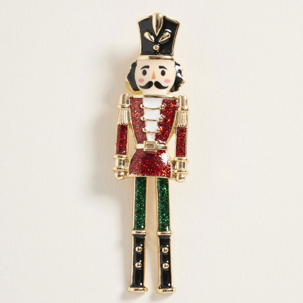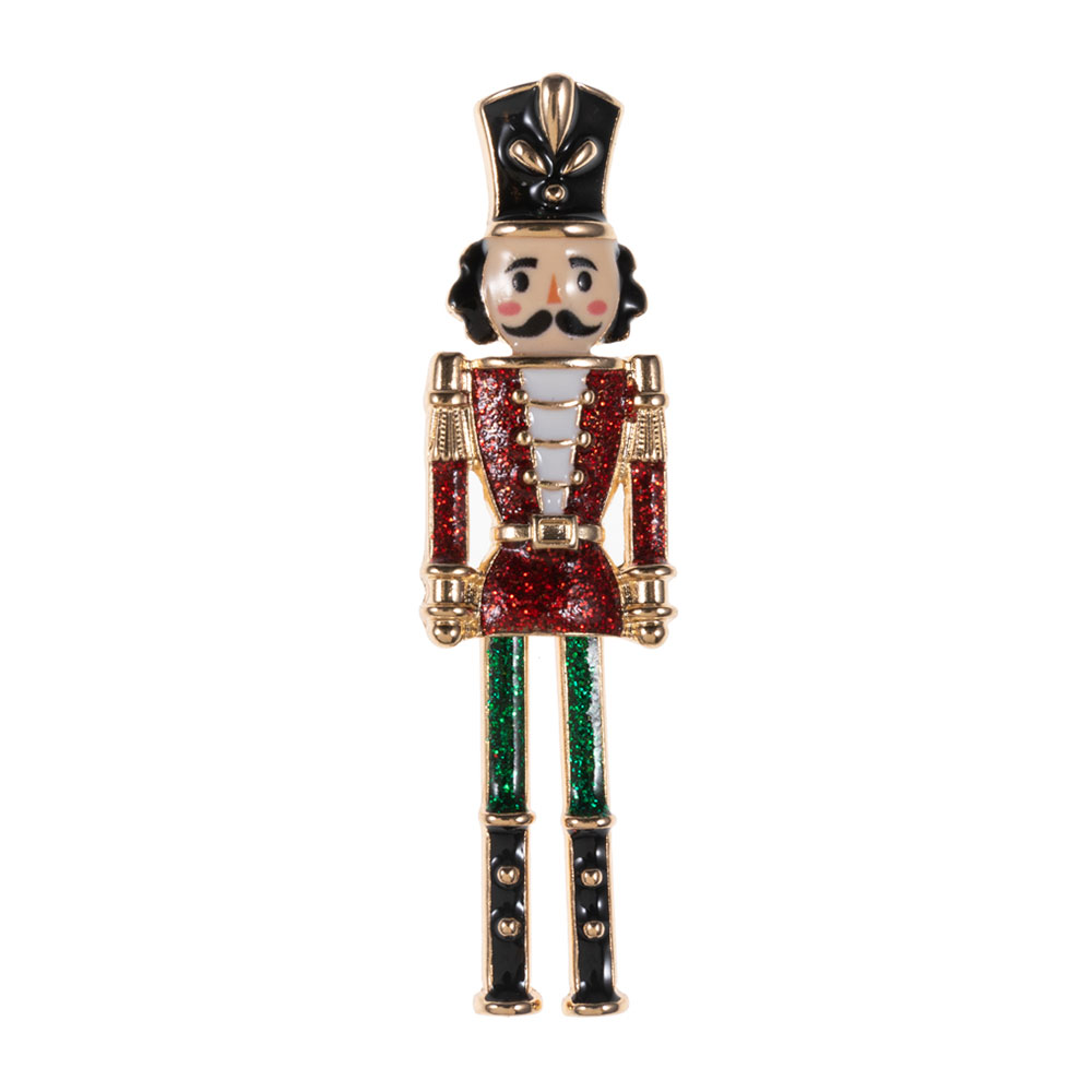 • Celebrate the season with a charming nutcracker soldier brooch featuring glittery detail and bold accents. A perfect holiday pin for coats, scarves, or festive party outfits.
