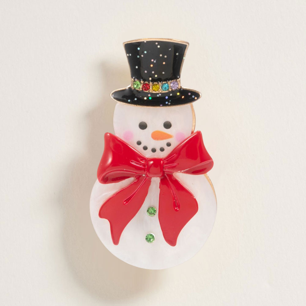• Celebrate the season in style with this adorable snowman brooch, accented by a bright bow and dazzling top hat. A cheerful holiday accessory to add playful elegance to any outfit.