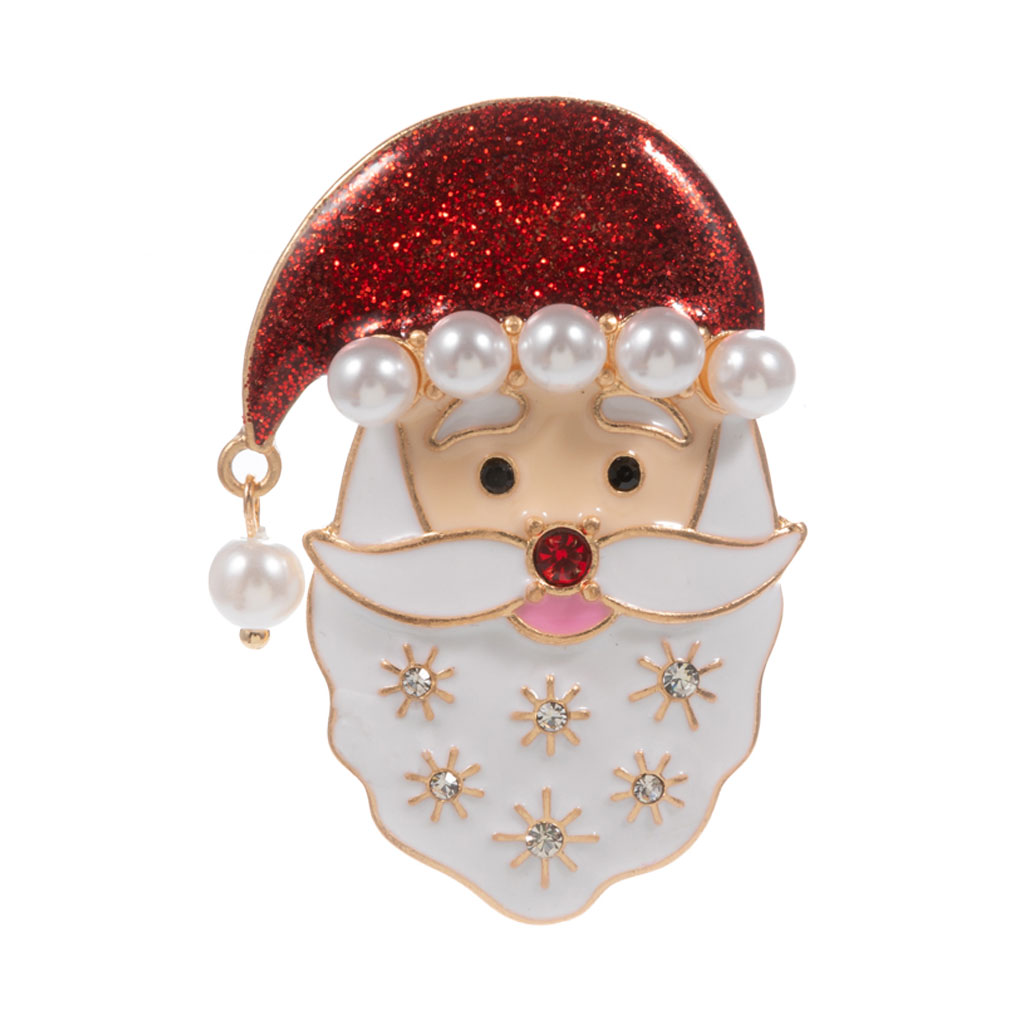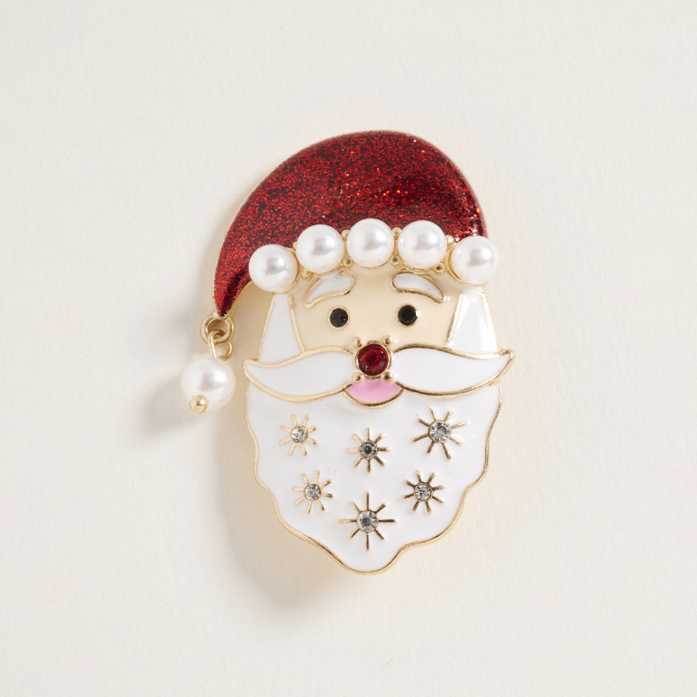 • Celebrate the season with a charming Santa Claus brooch, detailed with glimmering accents and pearl embellishments. A fun and festive accessory perfect for holiday parties and winter events.
