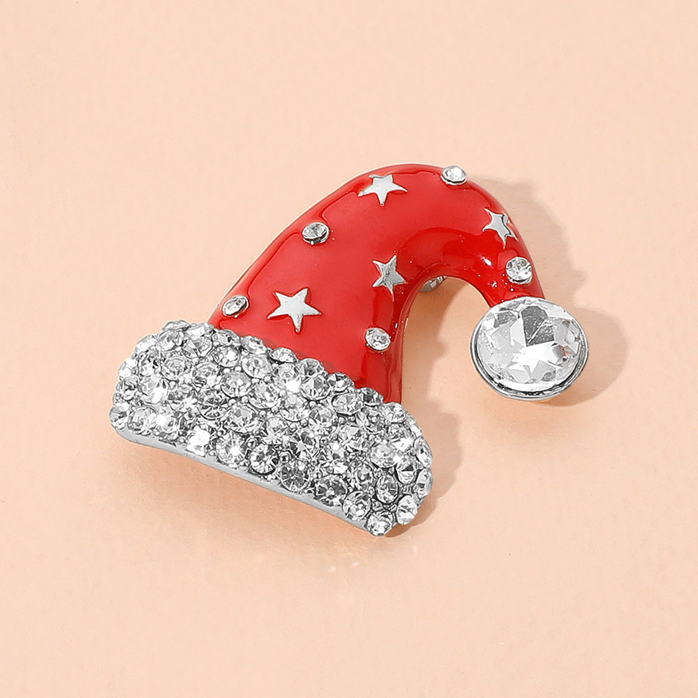 • Festive Santa hat brooch adorned with sparkling rhinestones and star accents. Perfect for adding holiday cheer to jackets, scarves, or bags during Christmas celebrations.