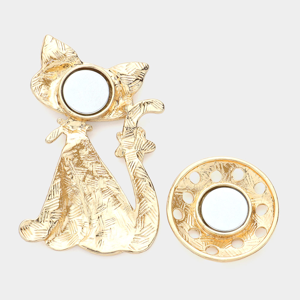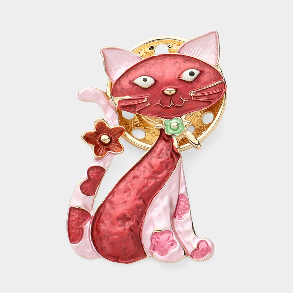 Details • Size : 1.25" X 2" • Magnetic Closure • No Pinhole Damage • Charming cat enamel brooch pin featuring a playful design with floral and heart details. A fun and stylish accessory to decorate jackets, scarves, or bags, perfect for cat lovers and unique fashion statements.