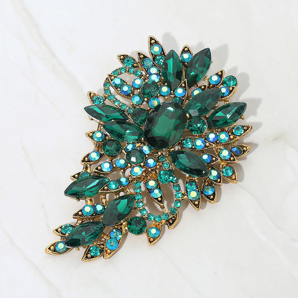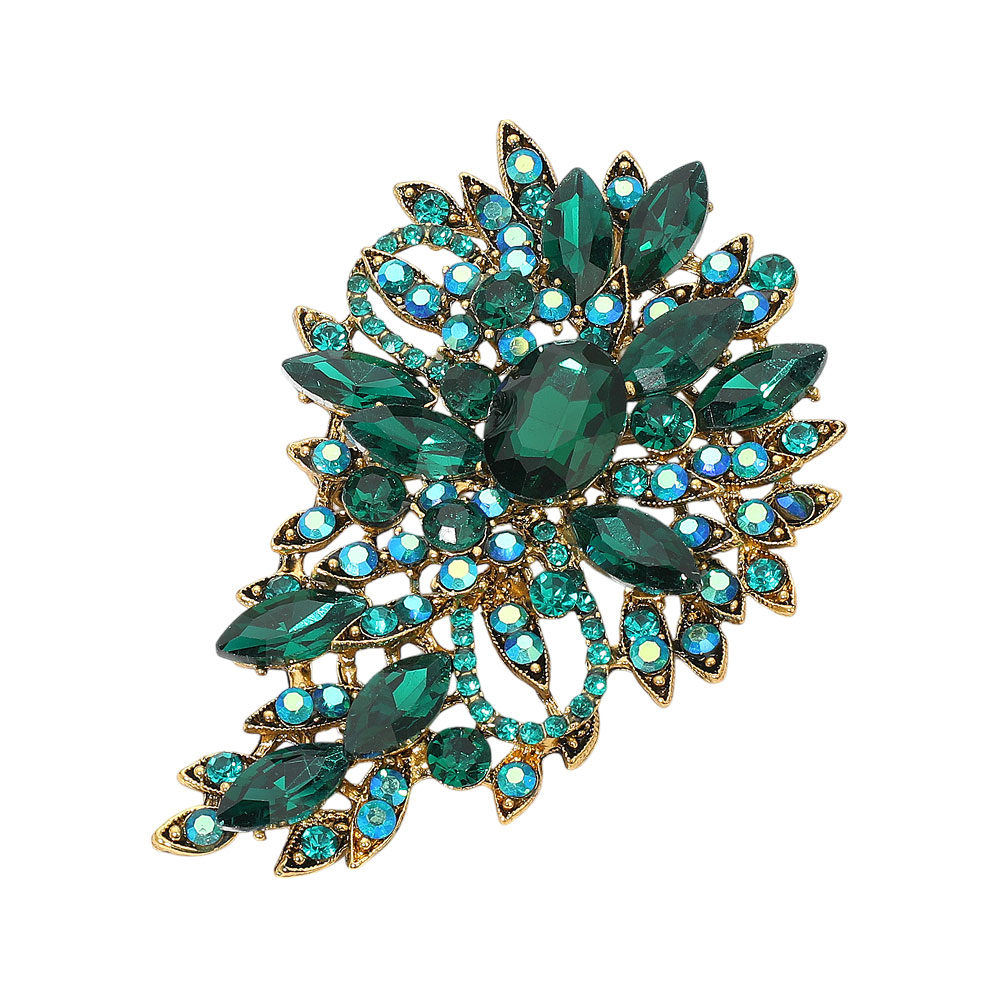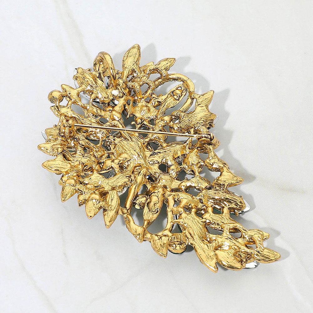 • Add a touch of glamour with this ornate crystal brooch featuring a layered leaf design and clustered faceted stones. Ideal for jackets, scarves, or eveningwear, this statement pin enhances any outfit with refined sparkle and artistic flair.